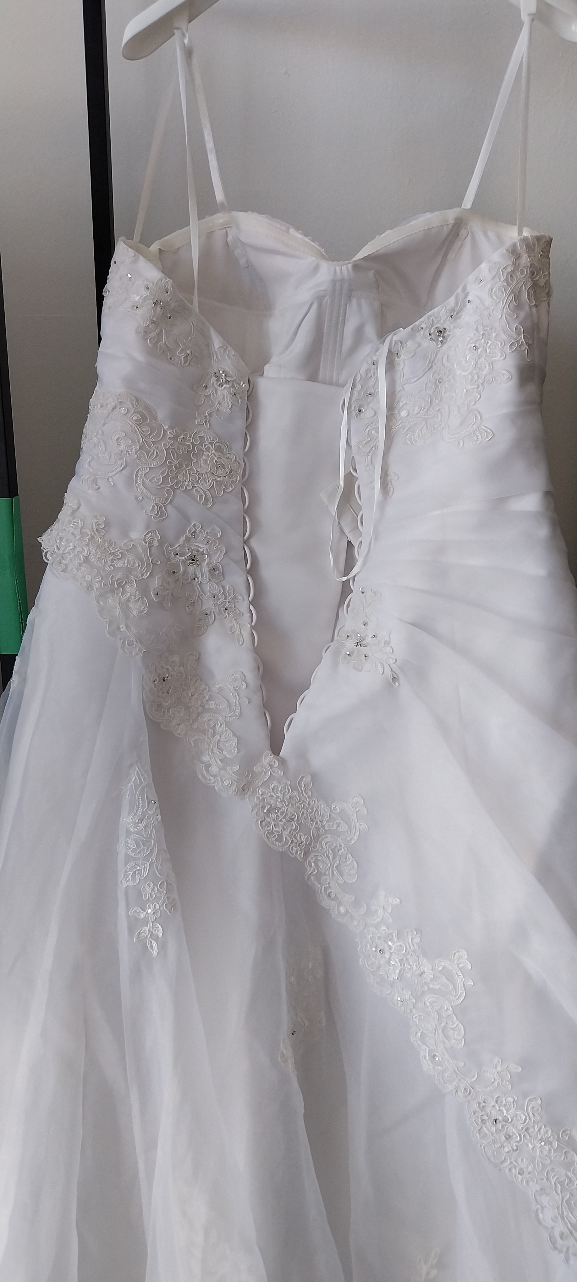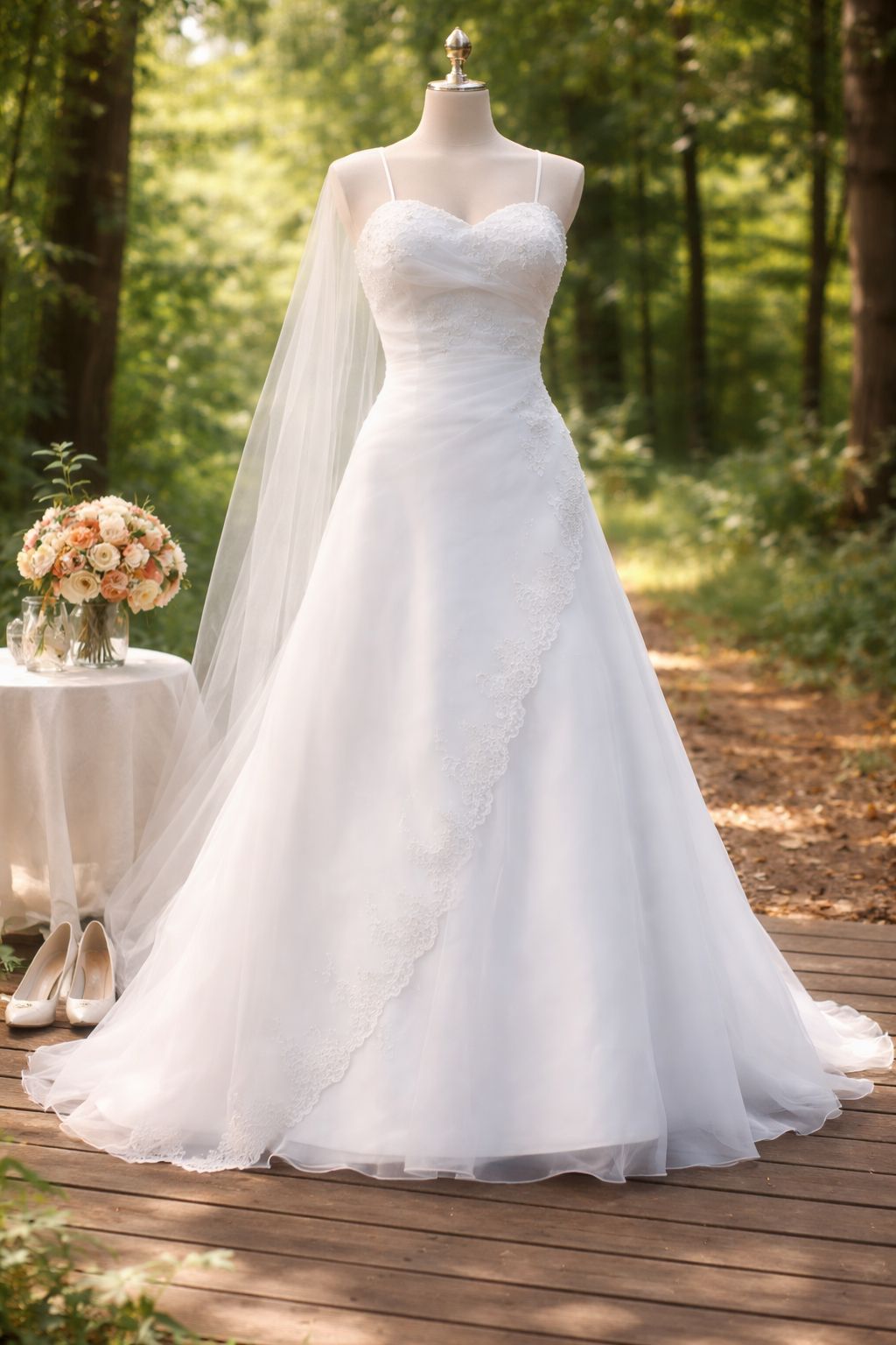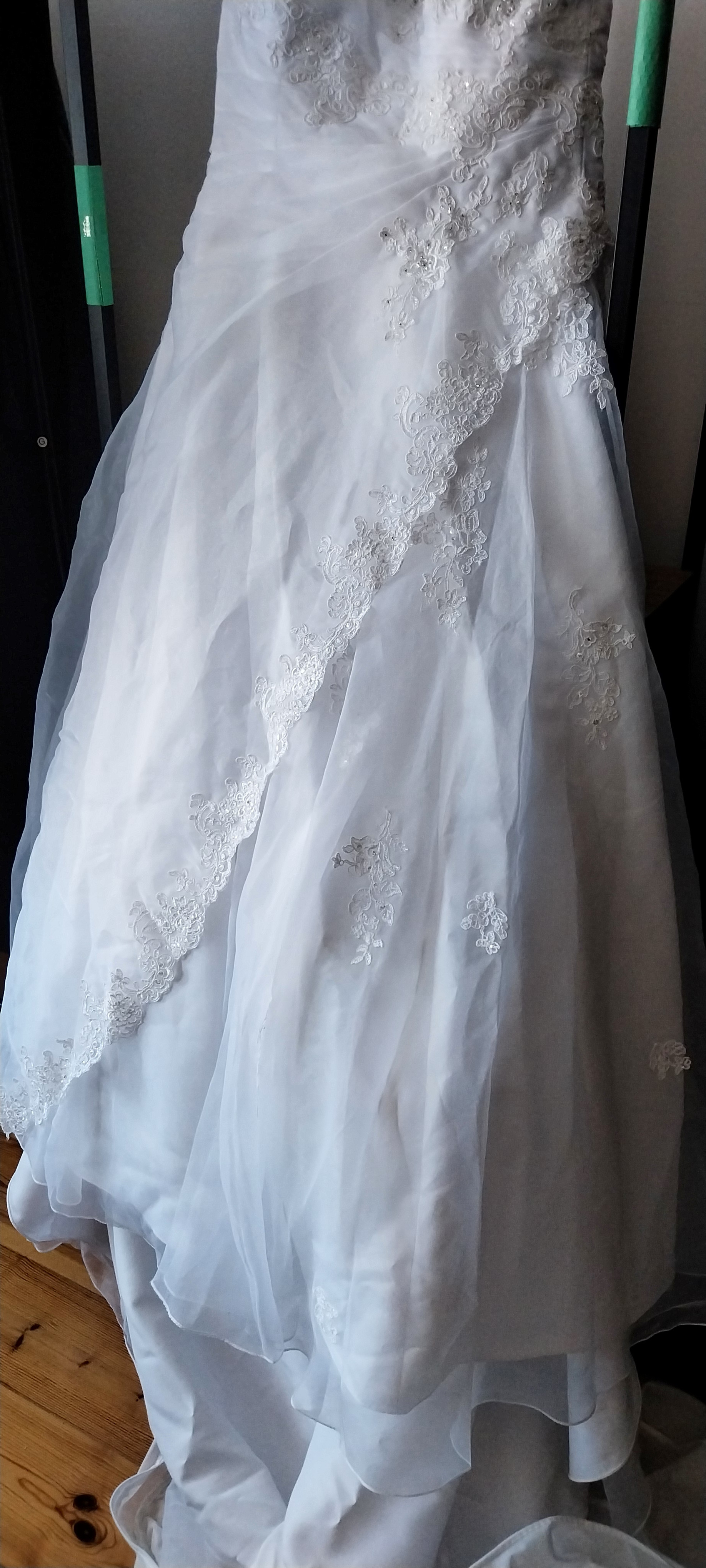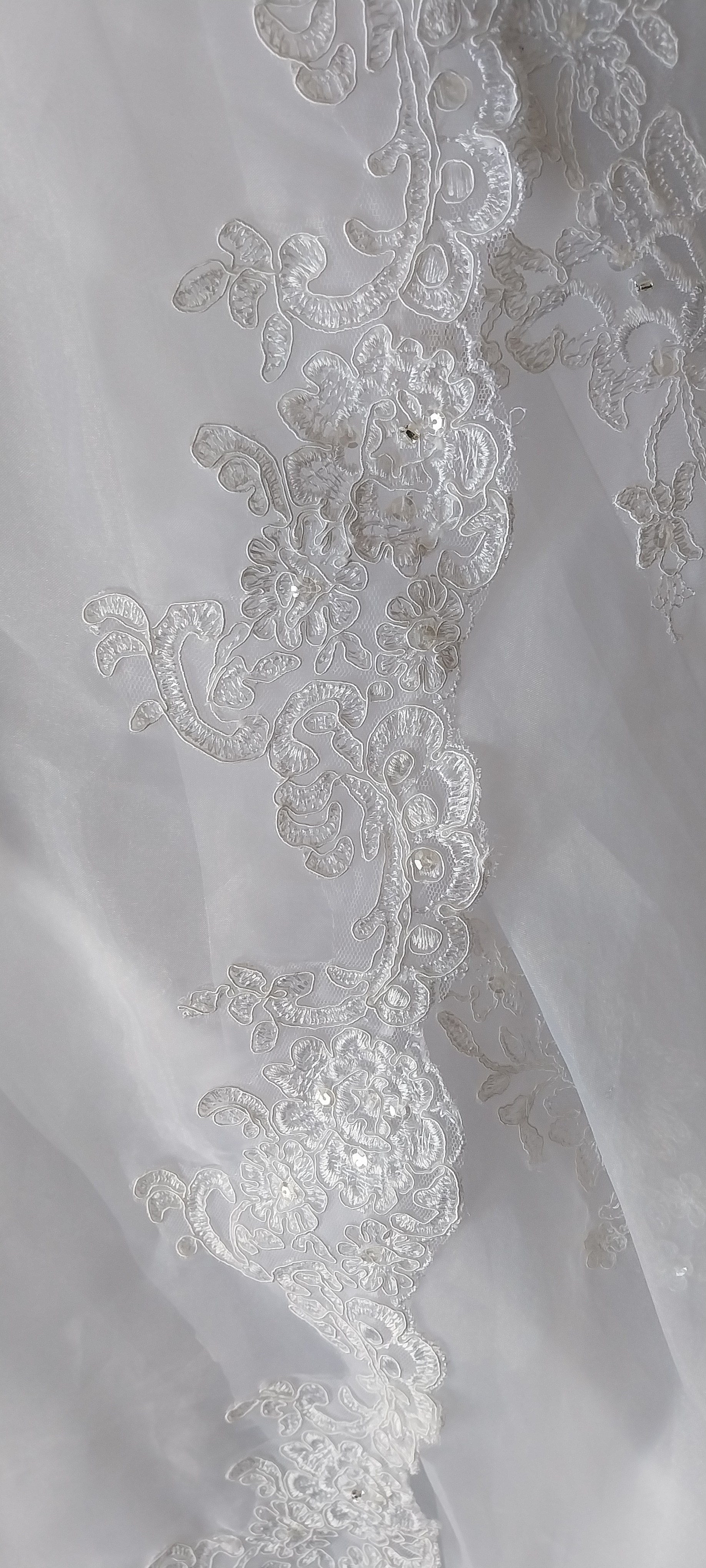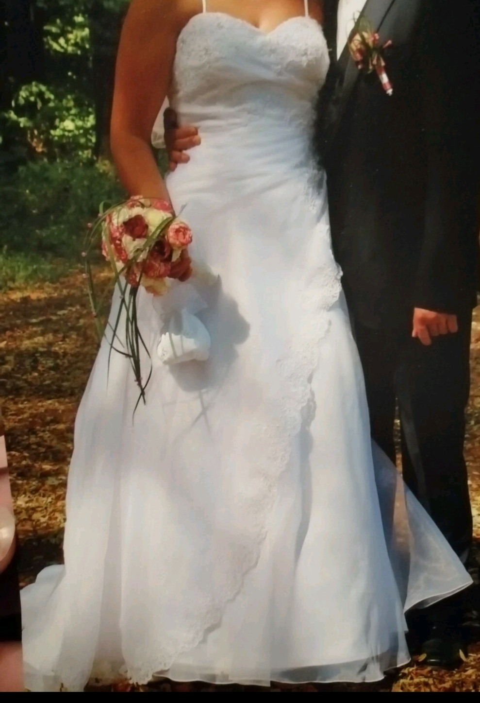 "Dieses Kleid ist mit Spitze und Glitzersteinchen besetzt. Die Corsage kann mit und ohne Träger getragen werden. Das Kleid wird im Rücken geschnürt und besitzt auch eine Schleppe, welche mit einer nicht sichtbaren Schlaufe getragen werden kann. Zu dem Kleid gibt es noch einen 2 stufigen Schleier mit dazu, welcher am Saum Stickereien und kleine hängende Steinchen aufweist. Auch die Handstulpen sowie den Brautschmuck und ein kleiner Brautbeutel sind mit dabei. "