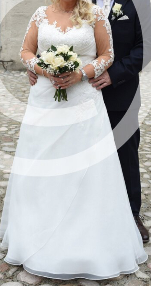 Größe: 44 - Ich trage Kleidung Gr 42 aber das Kleid ist in Gr 46. Ärmel mit Spitze wurde dazu gemacht . Reifrock anbei. Schuhe können gerne dazu gekauft werden in Silber -wurden auch im Brautgeschäft gekauft . Bin 164 cm und wiege 75 kg . Schuhabsatz 6 cm