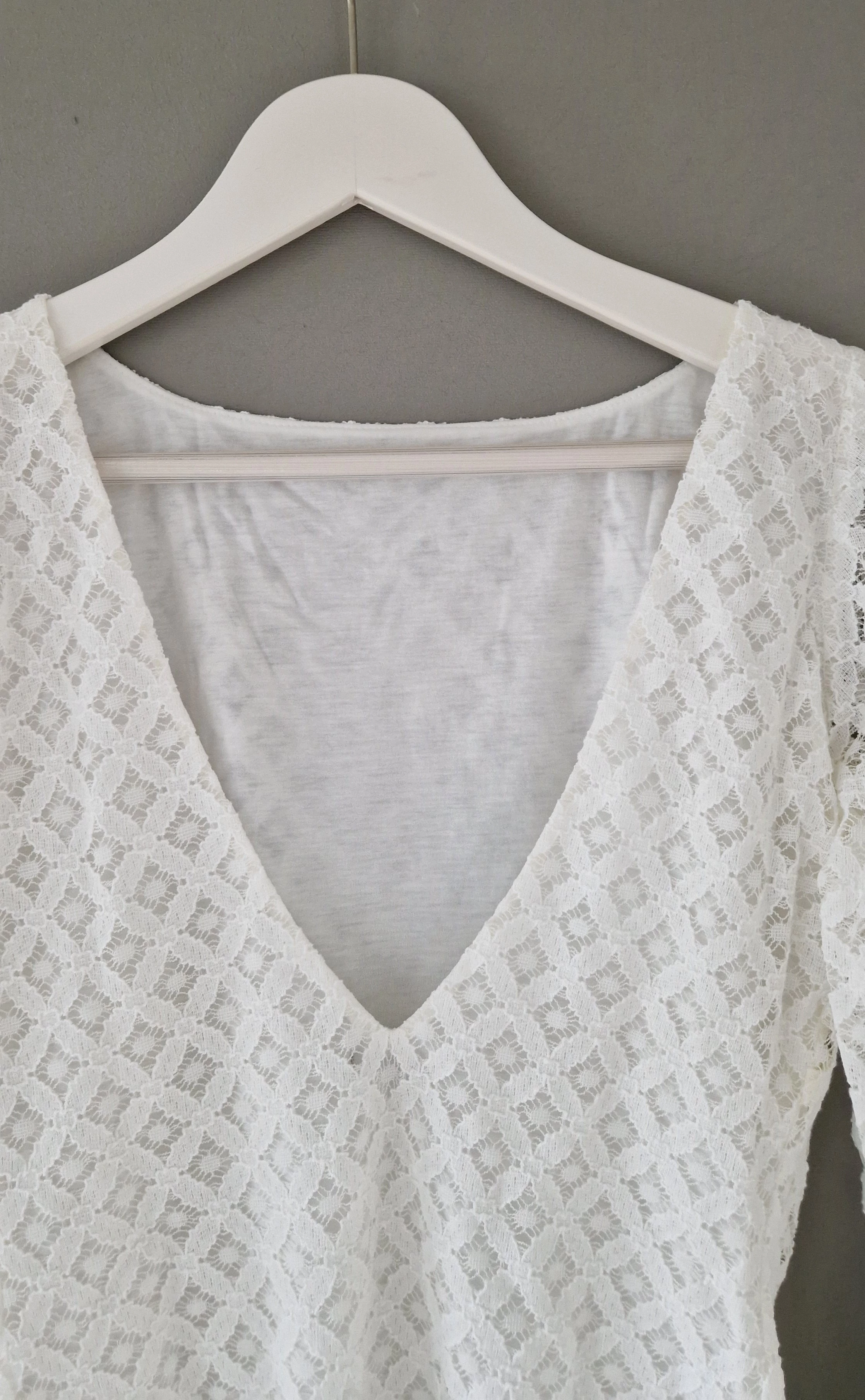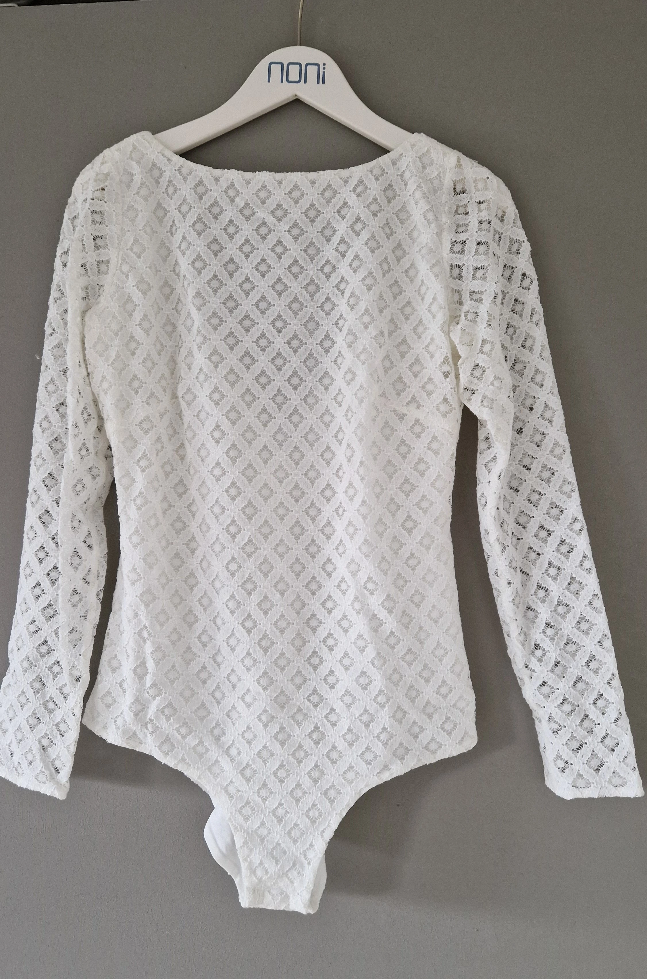 Der Body besticht durch sein feminines Spitzenmuster, die langen Ärmel, den tiefen Rückenausschnitt und die figurbetonte Passform- perfekt für einen romantischen und zeitlosen Look.