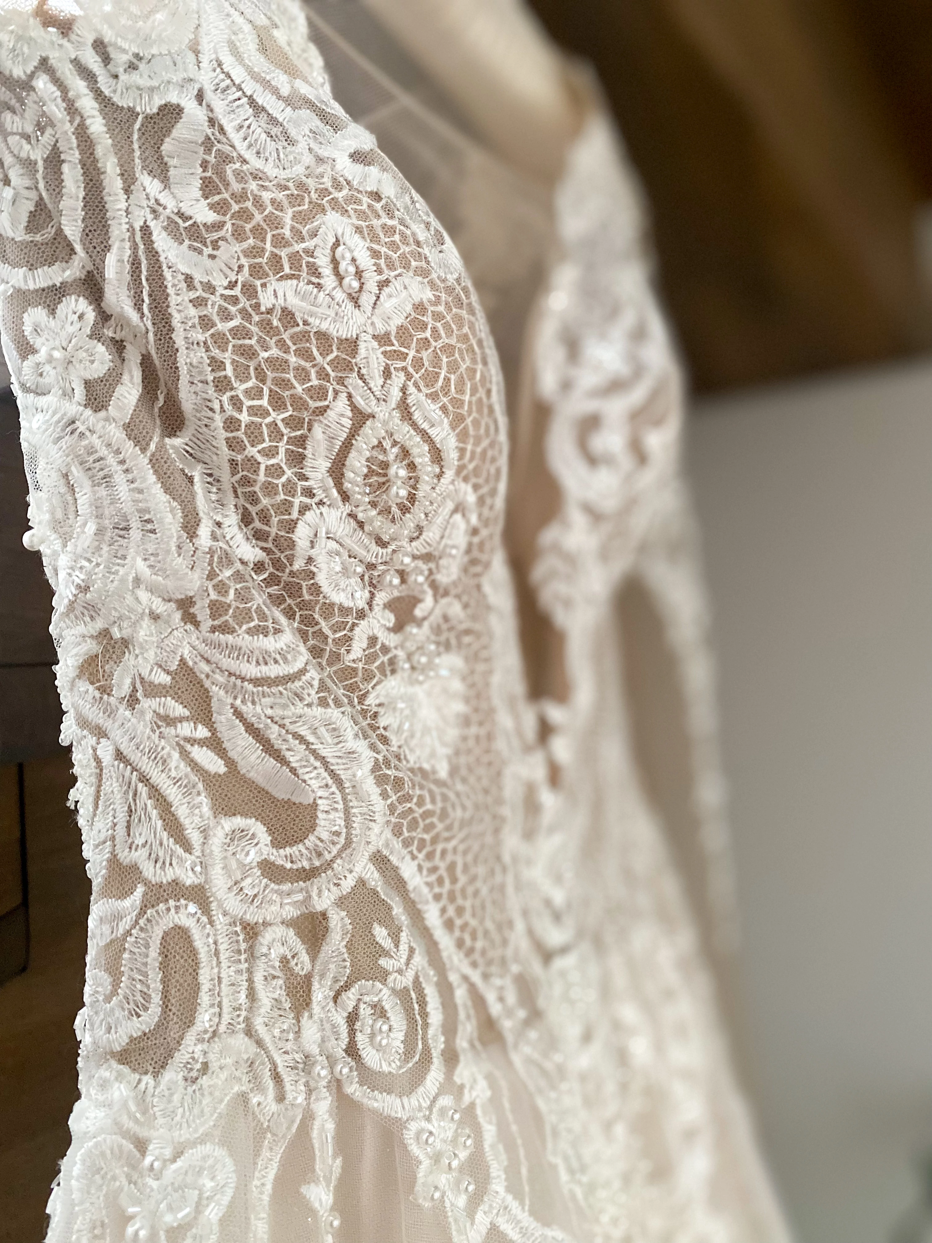 Aufwendige Spitze am gesamten Oberteil, Rücken und an den Ärmeln