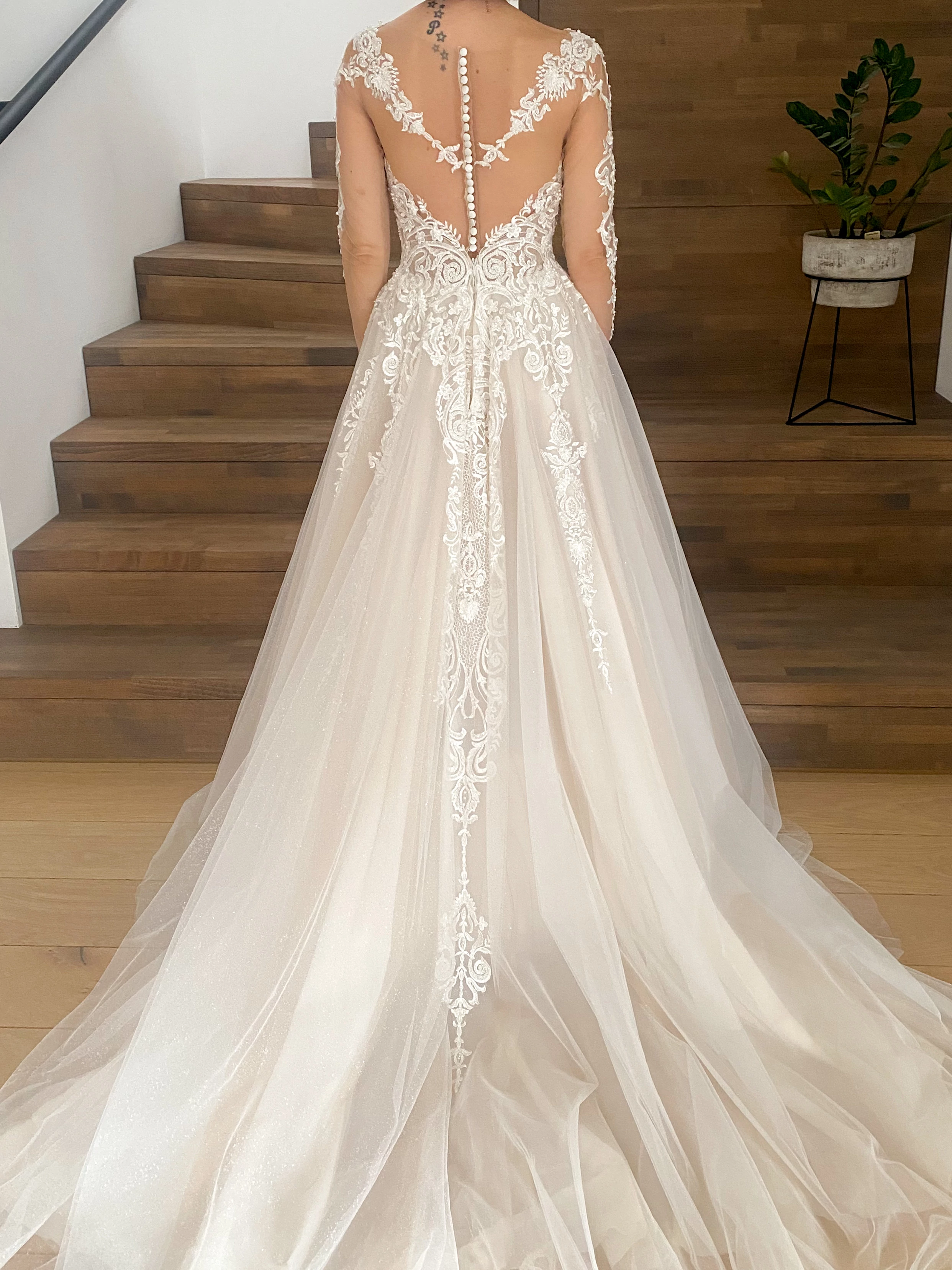 Der Neupreis lag bei 3000 €. Das Kleid wurde nie getragen, nie geändert (außer der Länge) und befindet sich in absolut makellosem Zustand.