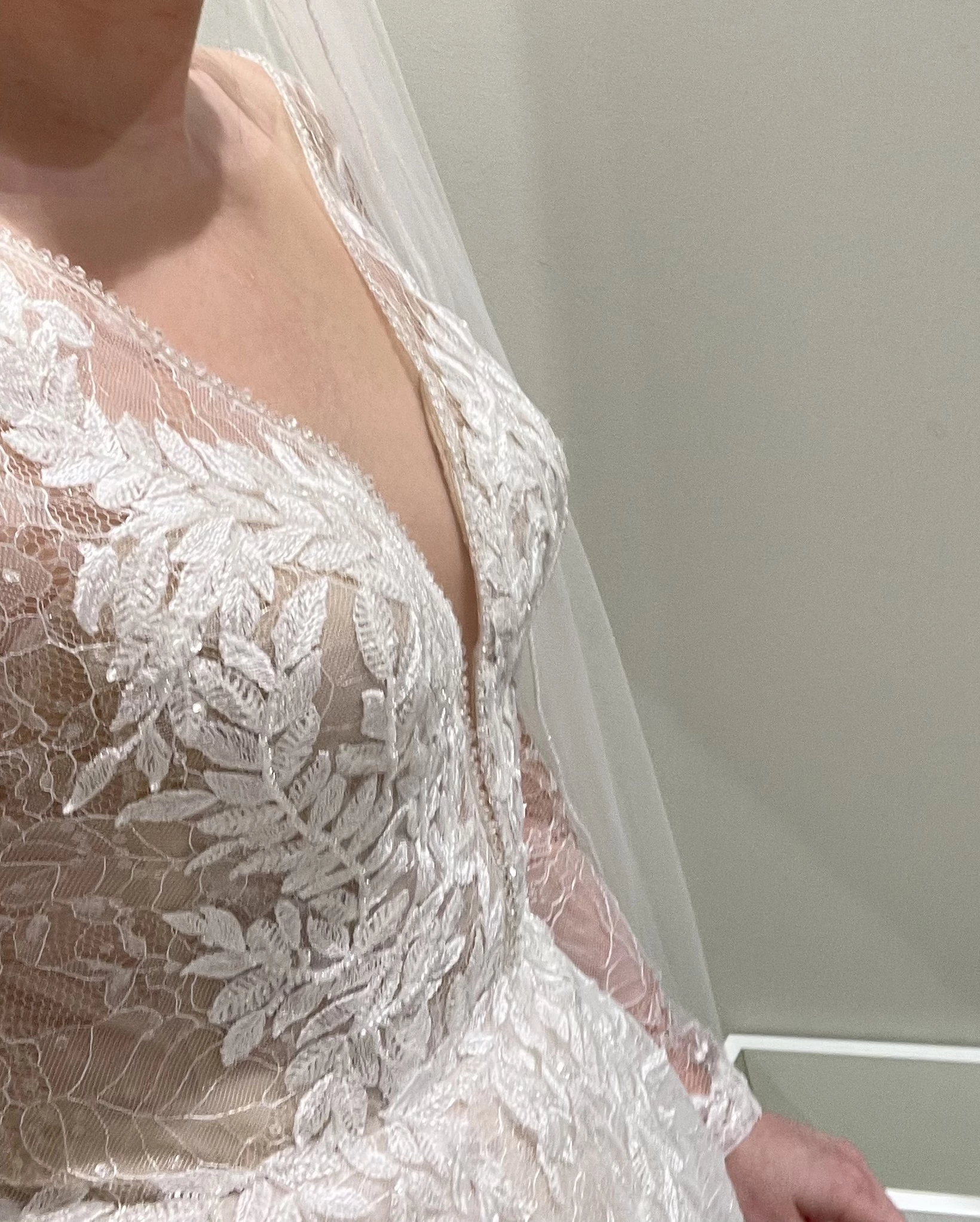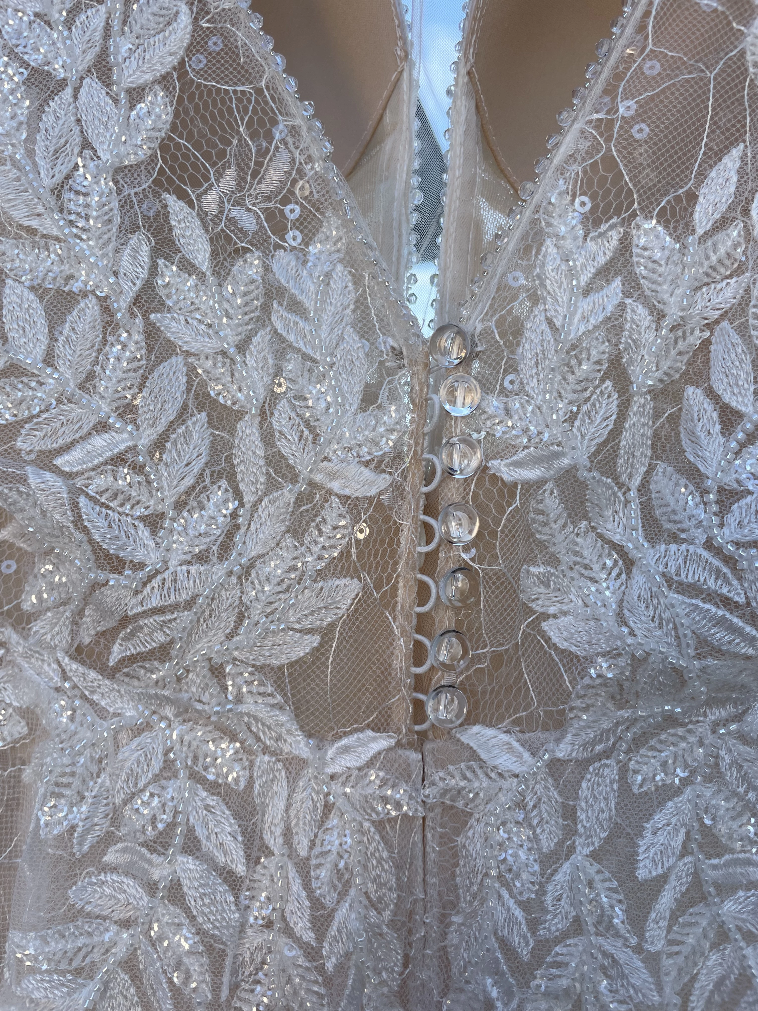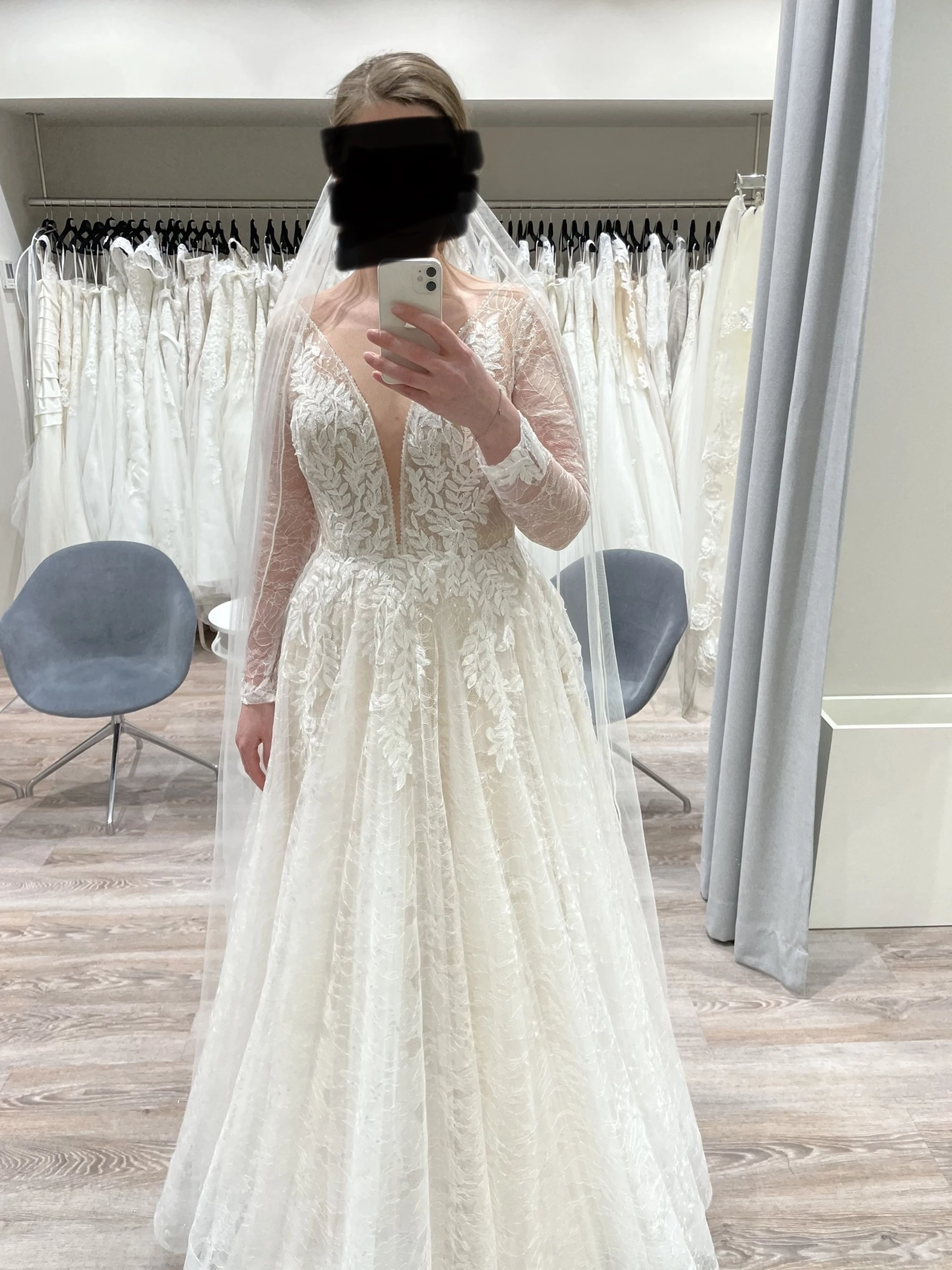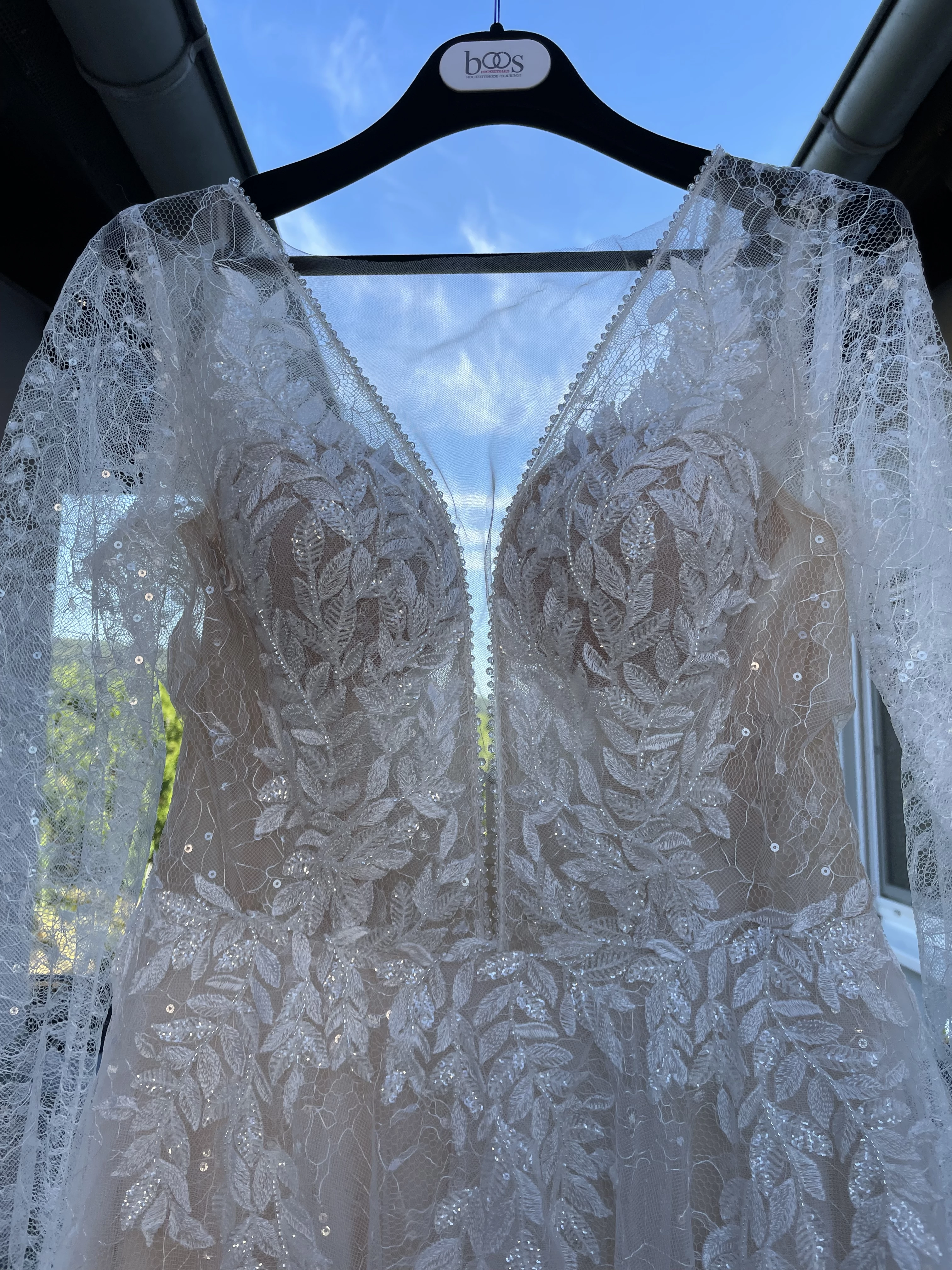 "Hallo ihr Lieben, ich verkaufe mein ungetragenes Brautkleid in Gr. 40/42 (fällt aber eher wie eine 40 aus). Es war einfach nicht "mein Kleid"... Daher entschied ich mich kurzfristig für ein anderes Brautkleid, welches ich zur Hochzeit trug. Daher ist dieses Kleid weder getragen, noch wurde etwas angepasst. Es besteht komplett aus Spitze in der Farbe ivory/blush mit einem cremefarbenen Unterrock. Es hat lange Ärmel in Spitze und einen tiefen Rückenausschnitt mit Knöpfen. Es besitzt keine Schleppe und hat schöne Spitzenapplikationen, die vom Oberteil in den Rock übergehen.