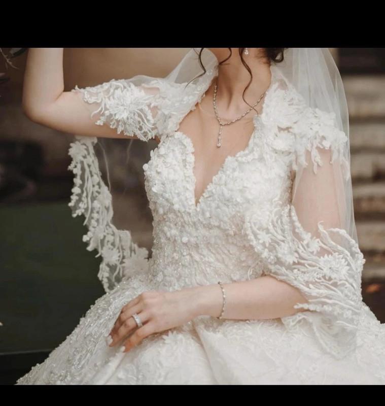 "Ich verkaufe mein wunderschönes Hochzeitskleid in Größe S und Farbe Creme. Es wurde nur einmal getragen und befindet sich in sehr gutem Zustand."