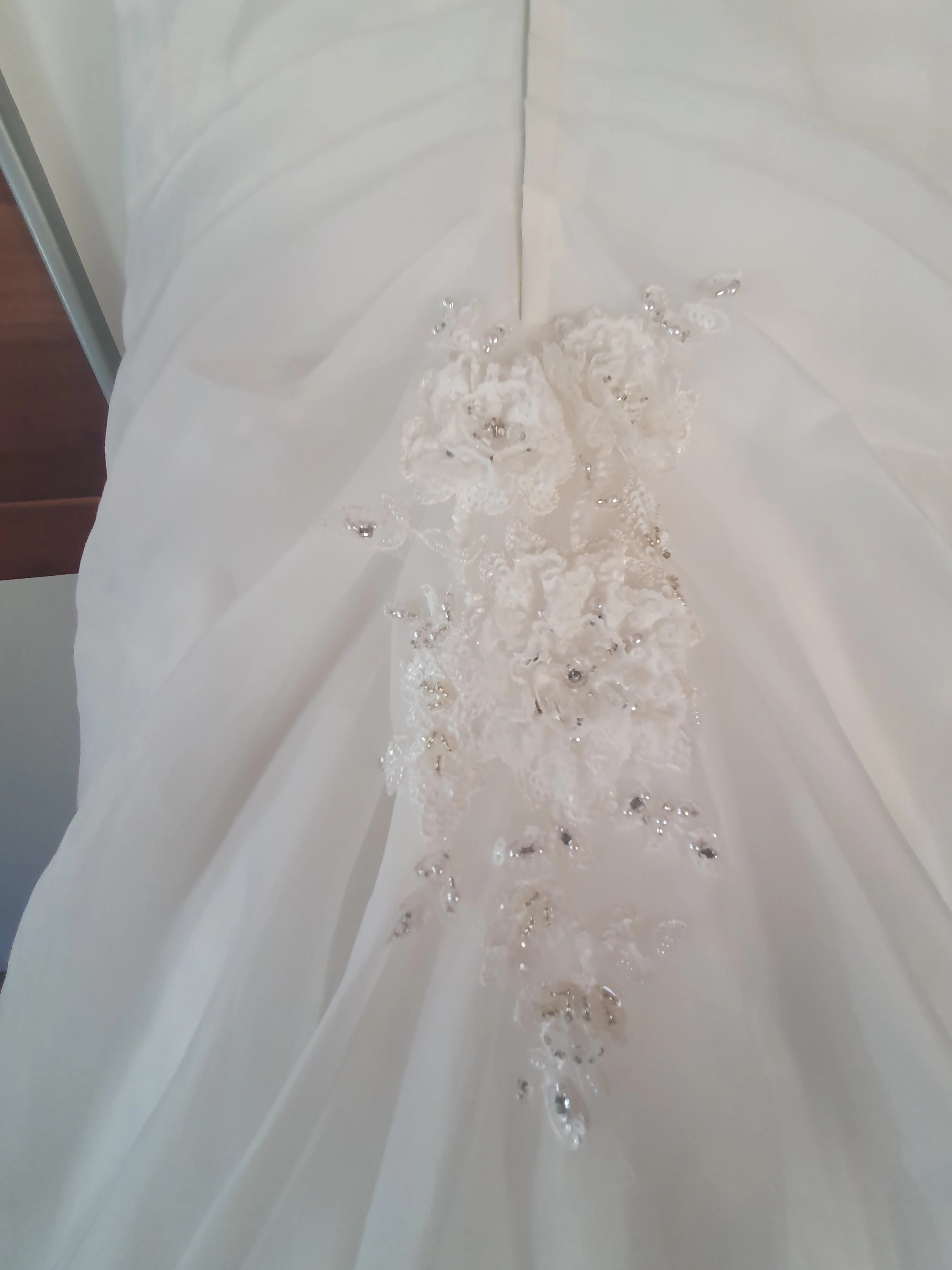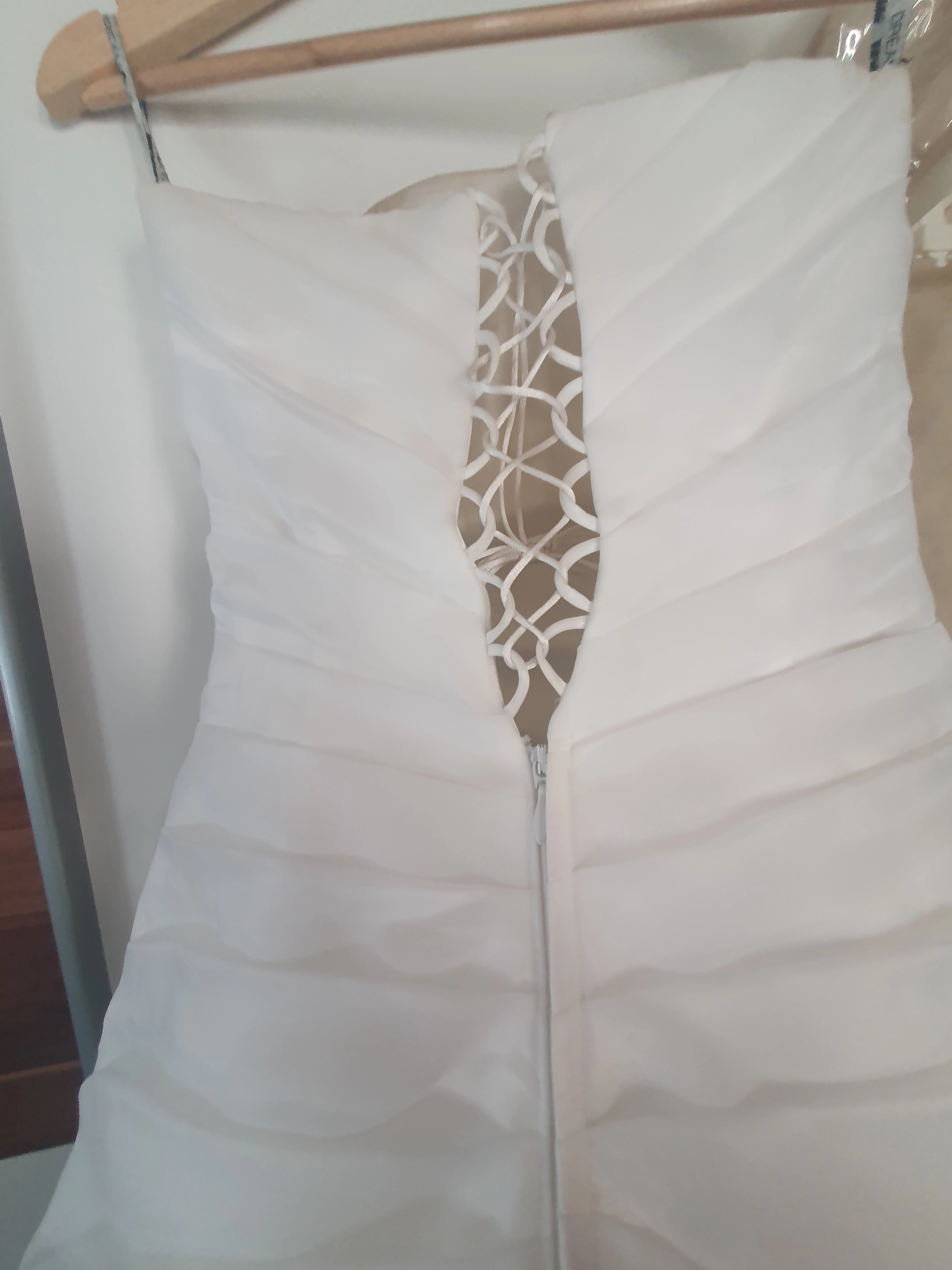 "Im Rücken Reißverschluss und zum schnüren. Perfekte Passform. Kein BH nötig. Reifrock und lange Schleppe. Es ist sehr bequem und hat eine super Passform.