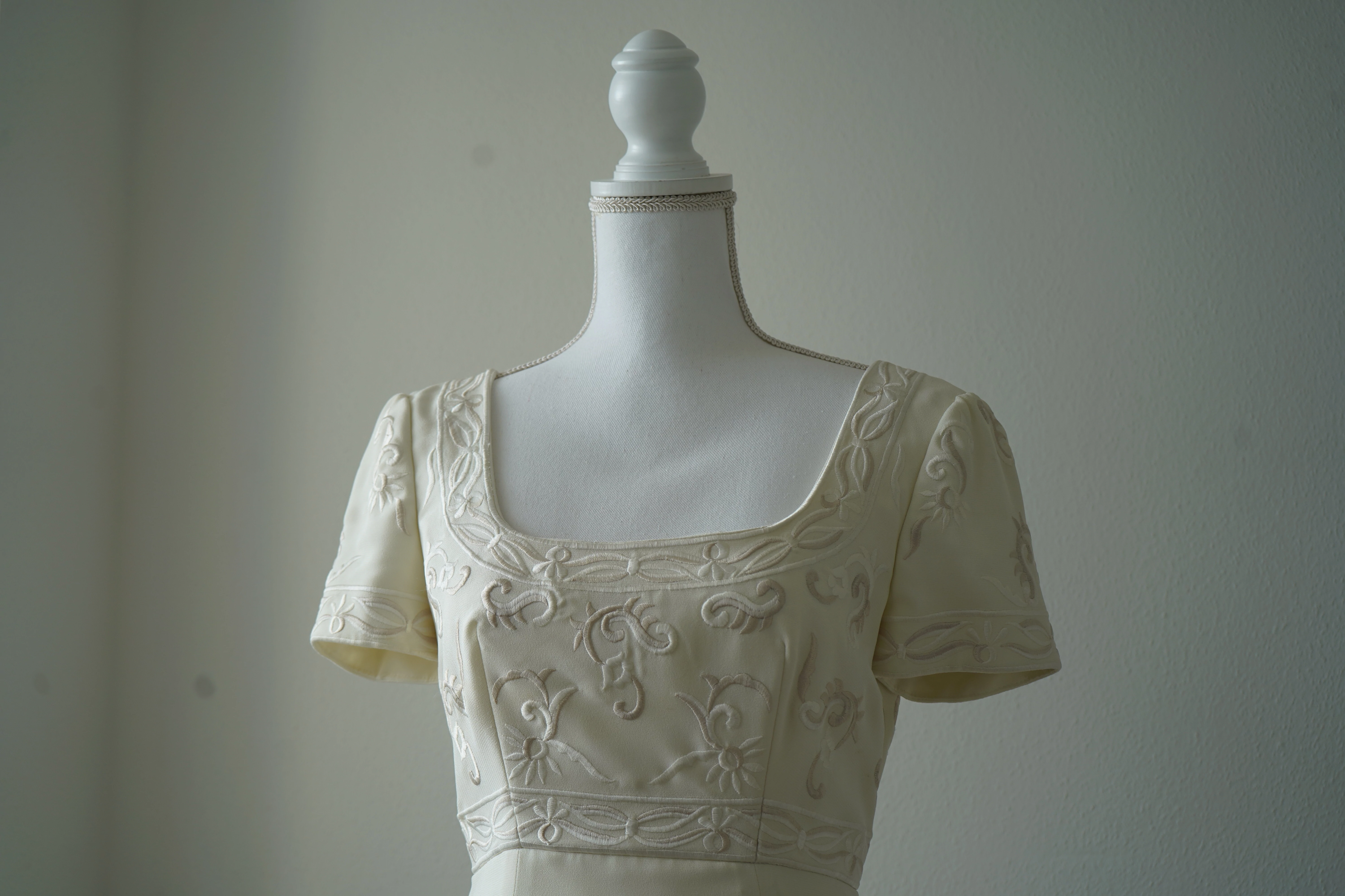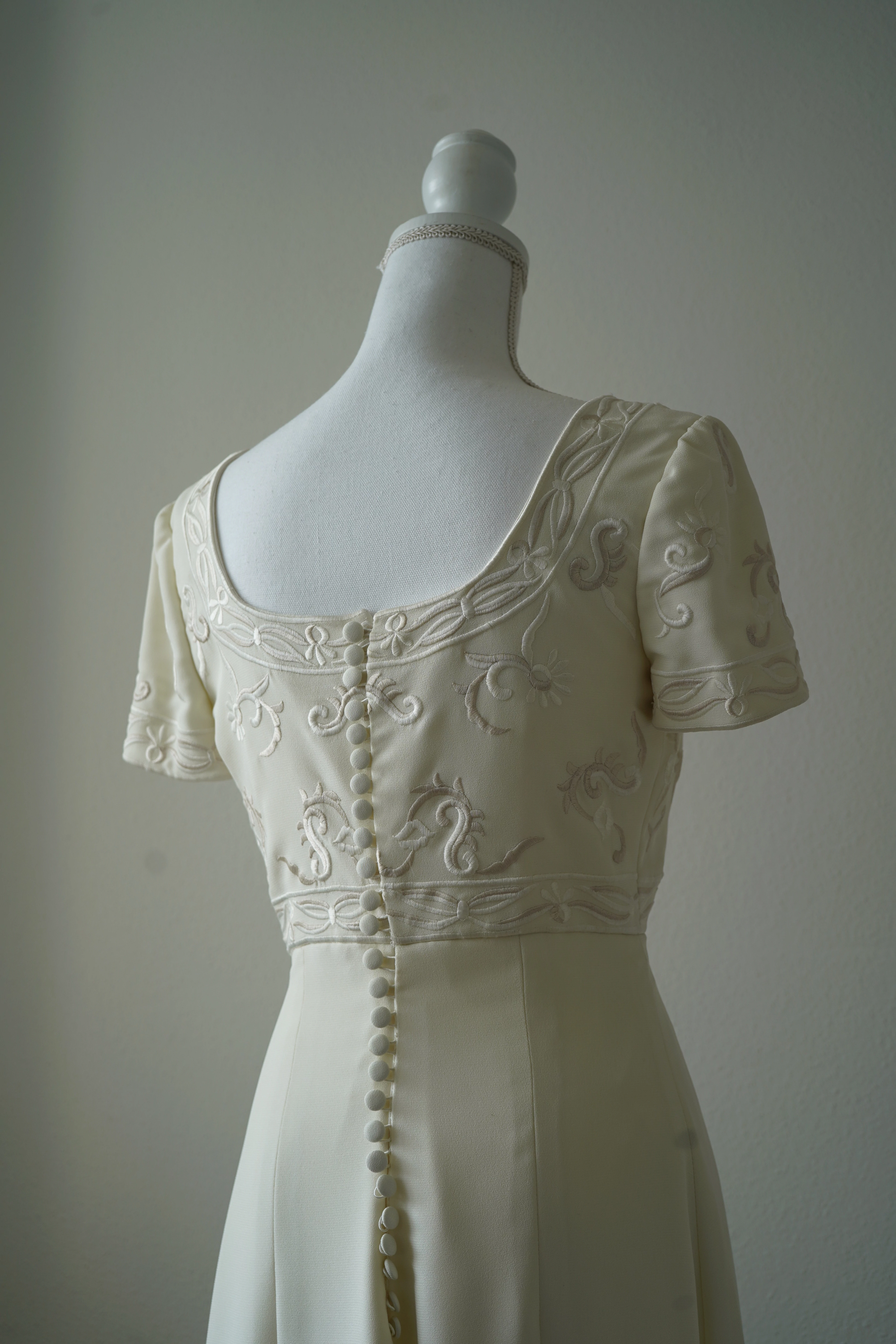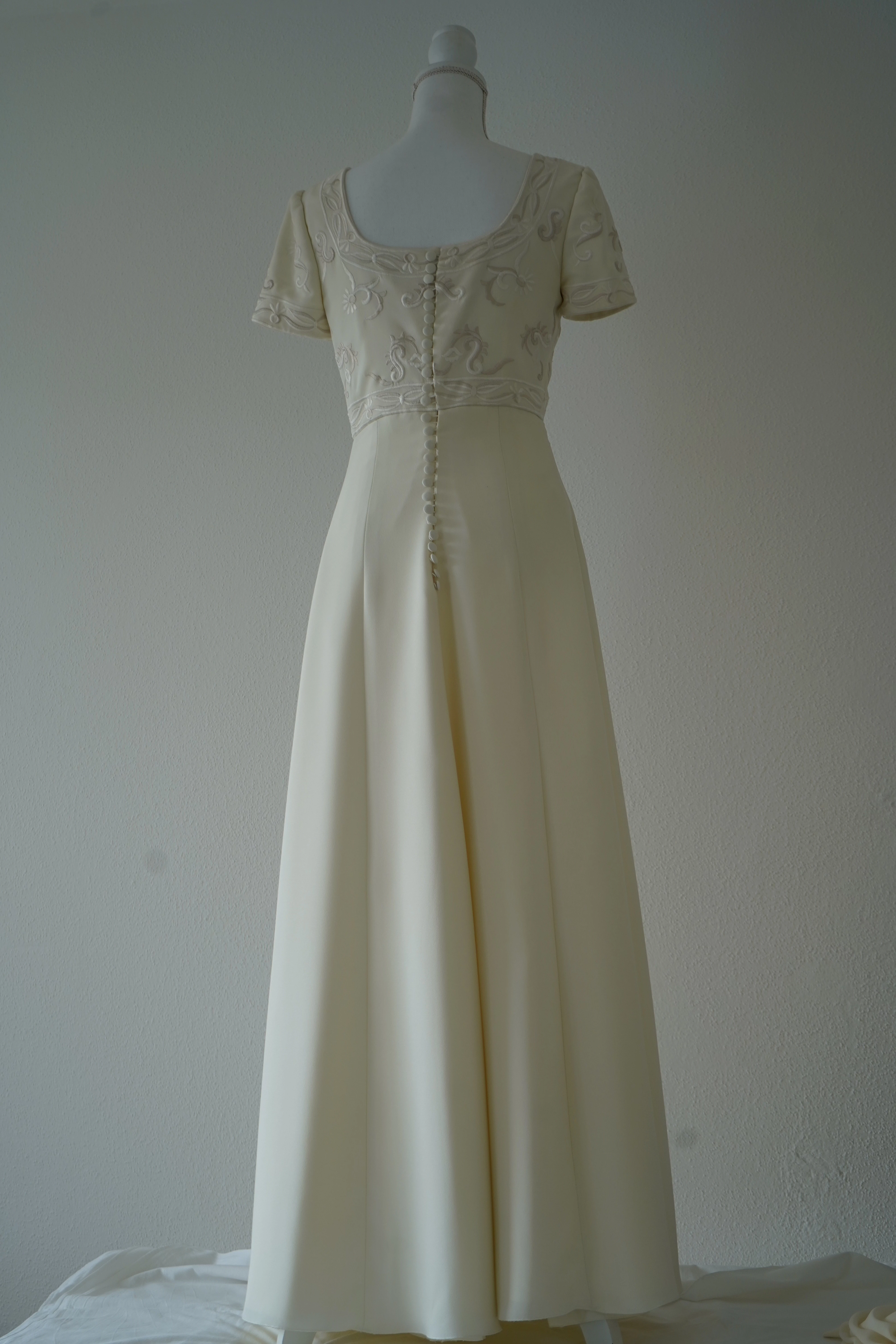 "Elegantes bodenlanges Brautkleid von PRONOVIAS Barcelona in A-Linie bzw. Empire-Stil, mit einem fließenden Stoff aus Crêpe. Durch den lockeren Schnitt und eine hohe Taille wird besonders die Brustpartie betont und die Aufmerksamkeit auf das Dekolletee gelenkt. Quadratischer Ausschnitt und kurze Ärmel. Gesamtes Oberteil mit wunderschöner zweifarbiger Stickerei in Weiß- bzw. Cremetönen aus hochwertigsten Stoffe, mit Liebe, Raffinesse und Qualität gefertigt. Edle Knopfleiste am Rücken.