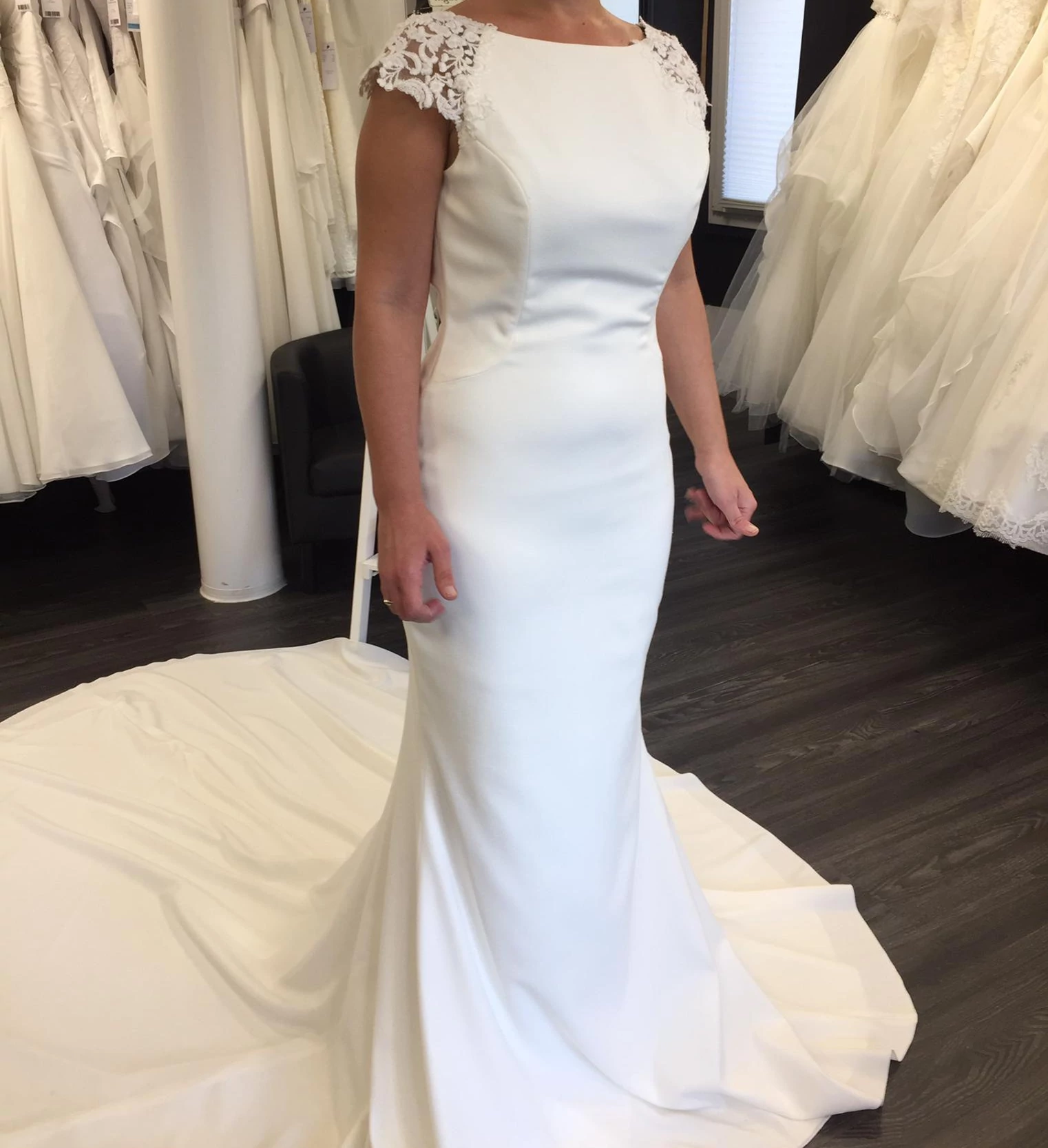 "Das Hochzeitskleid **Fiana** von **White One** ist ein elegantes und figurbetontes Kleid im Mermaid-Stil. Es besteht aus hochwertigem Crêpe-Stoff, der den Körper elegant umschmeichelt und eine schlanke Silhouette betont. Das Kleid zeichnet sich durch einen Bateau-Ausschnitt und kurze Cap-Ärmel aus, die dem Design eine klassische Note verleihen. Der Rücken ist offen und wird durch filigrane Stickereien, die teilweise durchsichtige Effekte erzeugen, kunstvoll verziert. Dieses Design sorgt für eine perfekte Balance zwischen traditionellem und modernem Stil und unterstreicht die romantische Ausstrahlung"