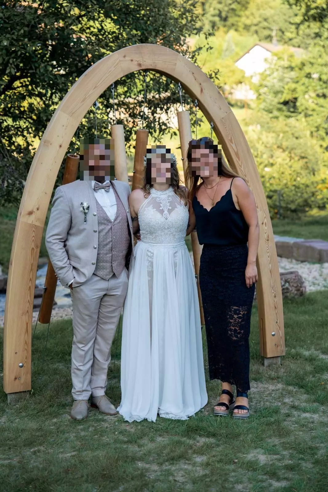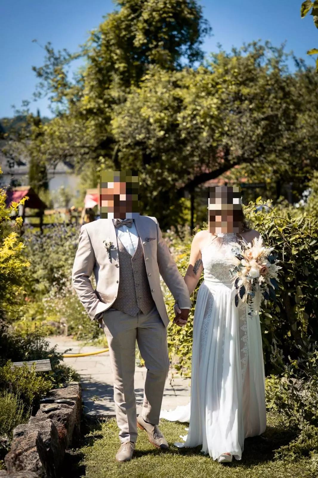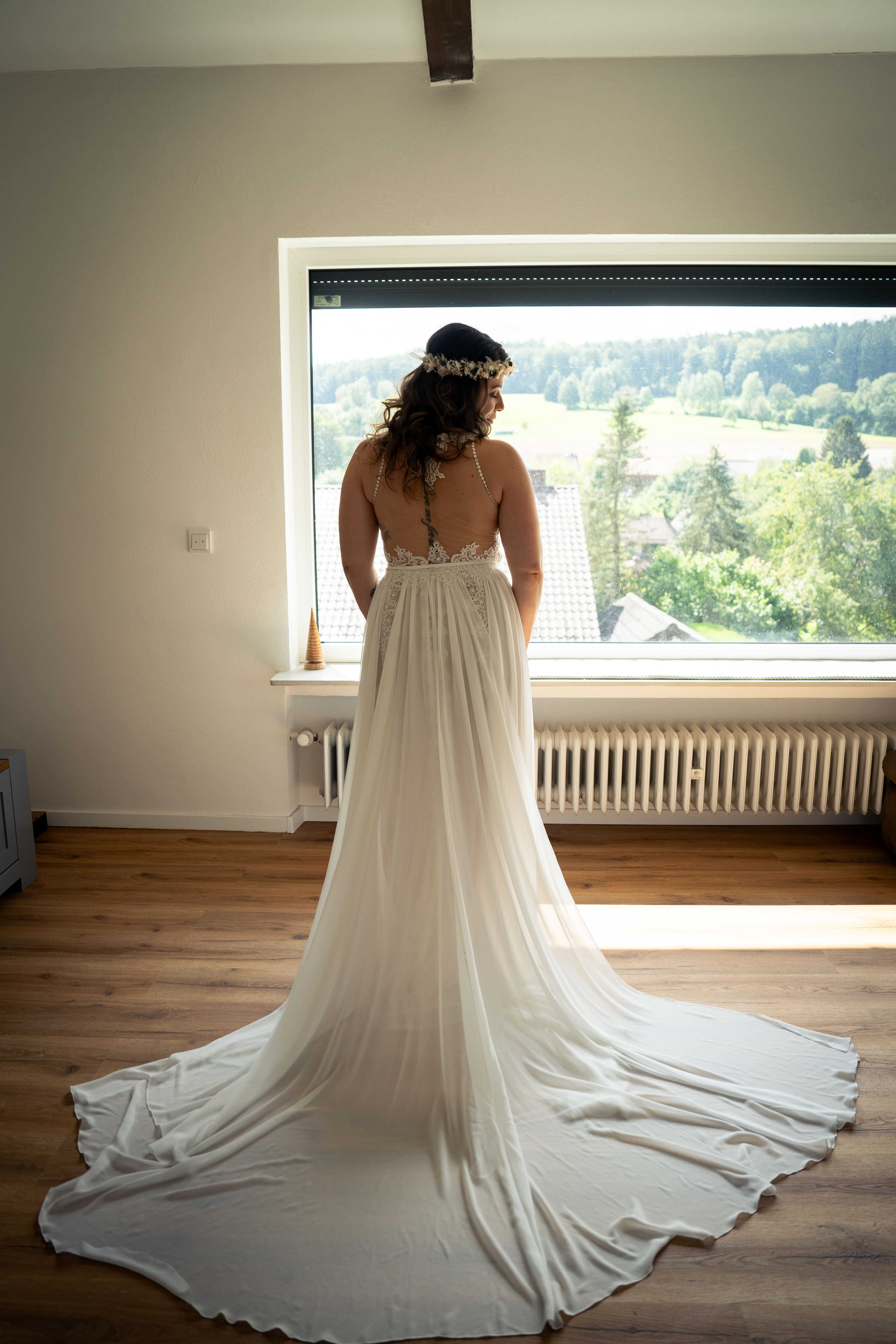 "Das Kleid ist in seiner Art Einzigartig! Ein absoluter Hingucker obwohl es schlicht fallend ist. Die Schleppe ist in einzelne Bänder aufgeteilt. Diese wurden extra durch eine Schneiderin zum hochstecken angepasst.