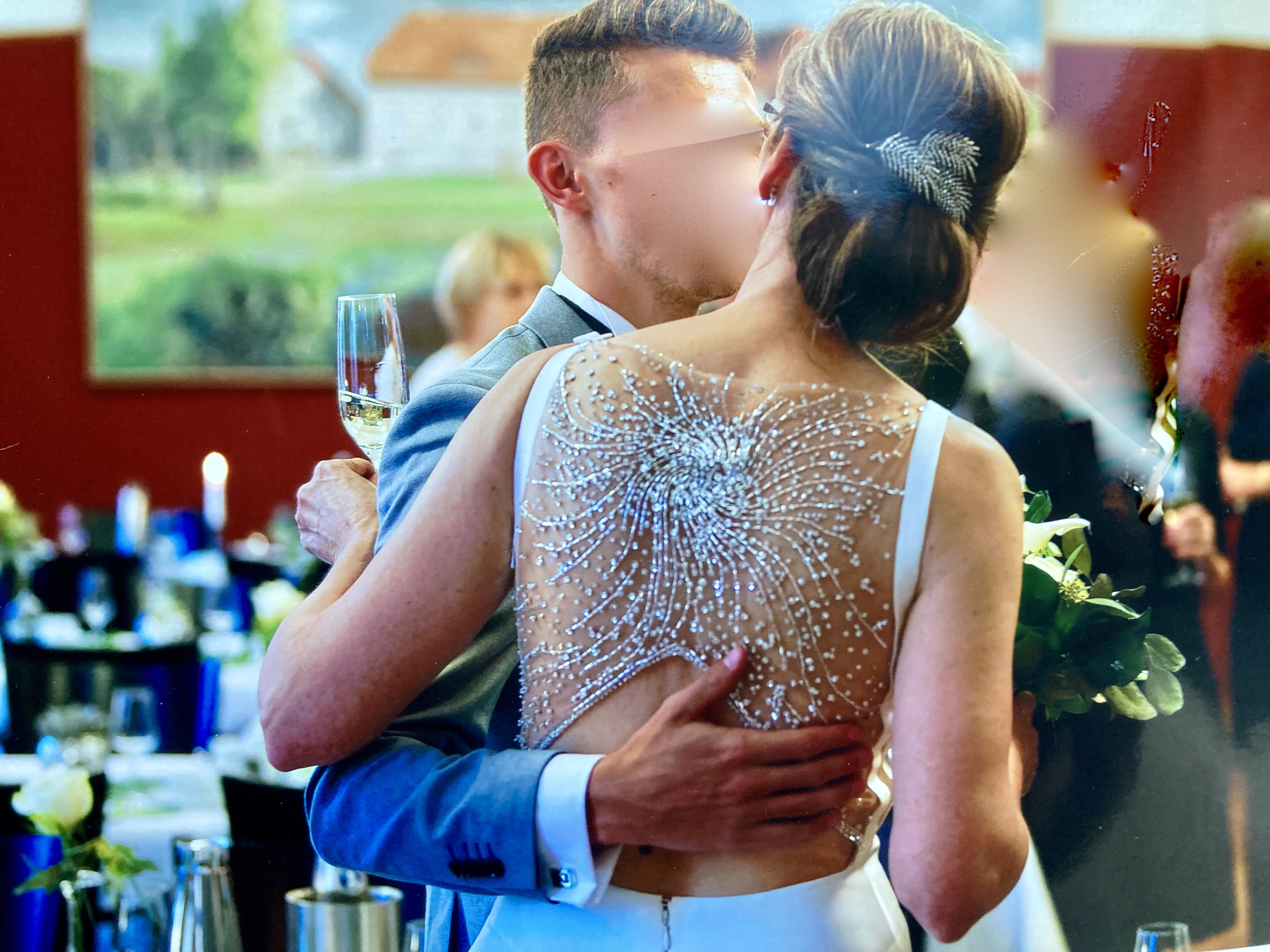 "Elegantes Brautkleid mit atemberaubender silberfarbener Strass-Stickerei am Rücken"