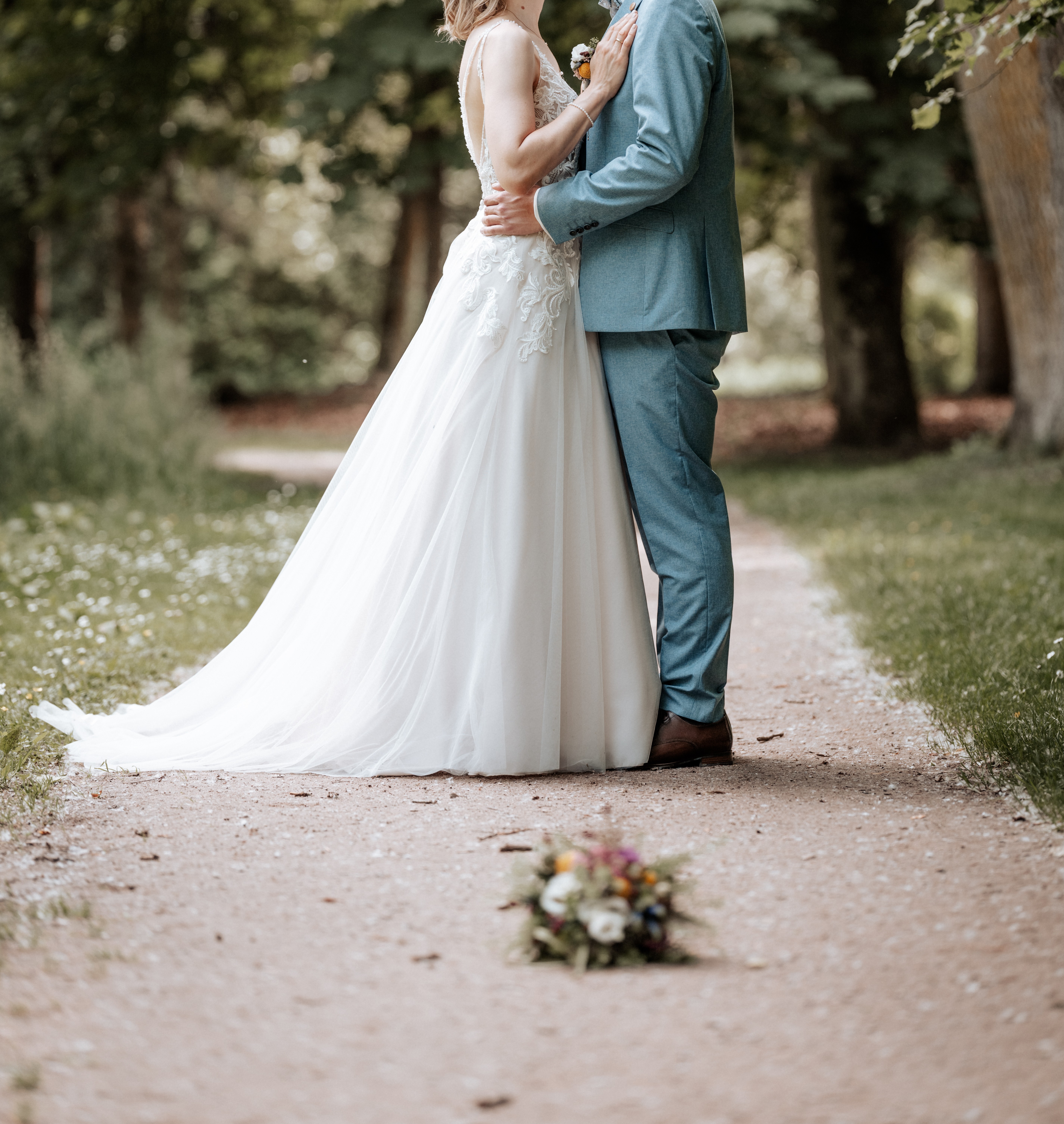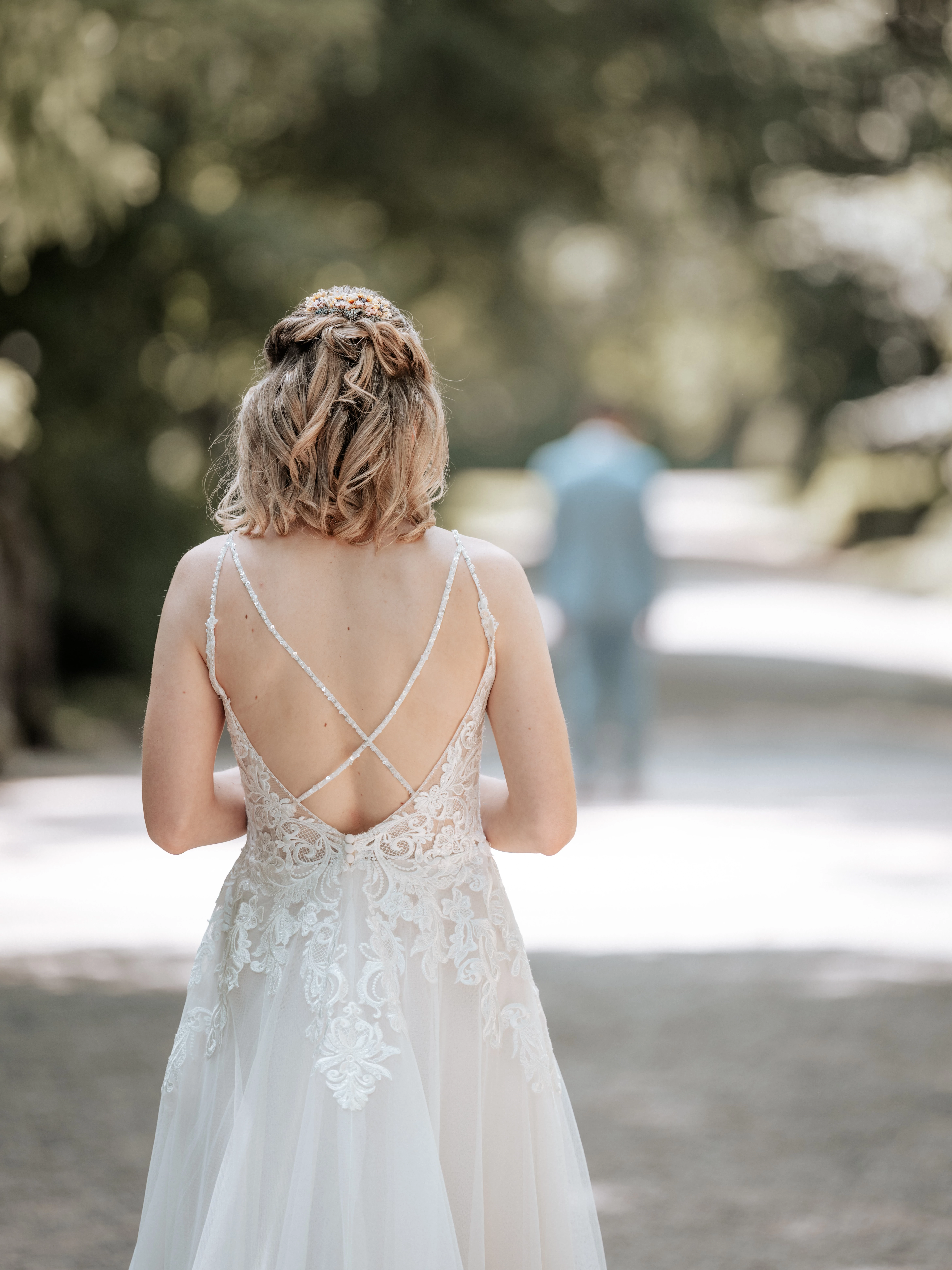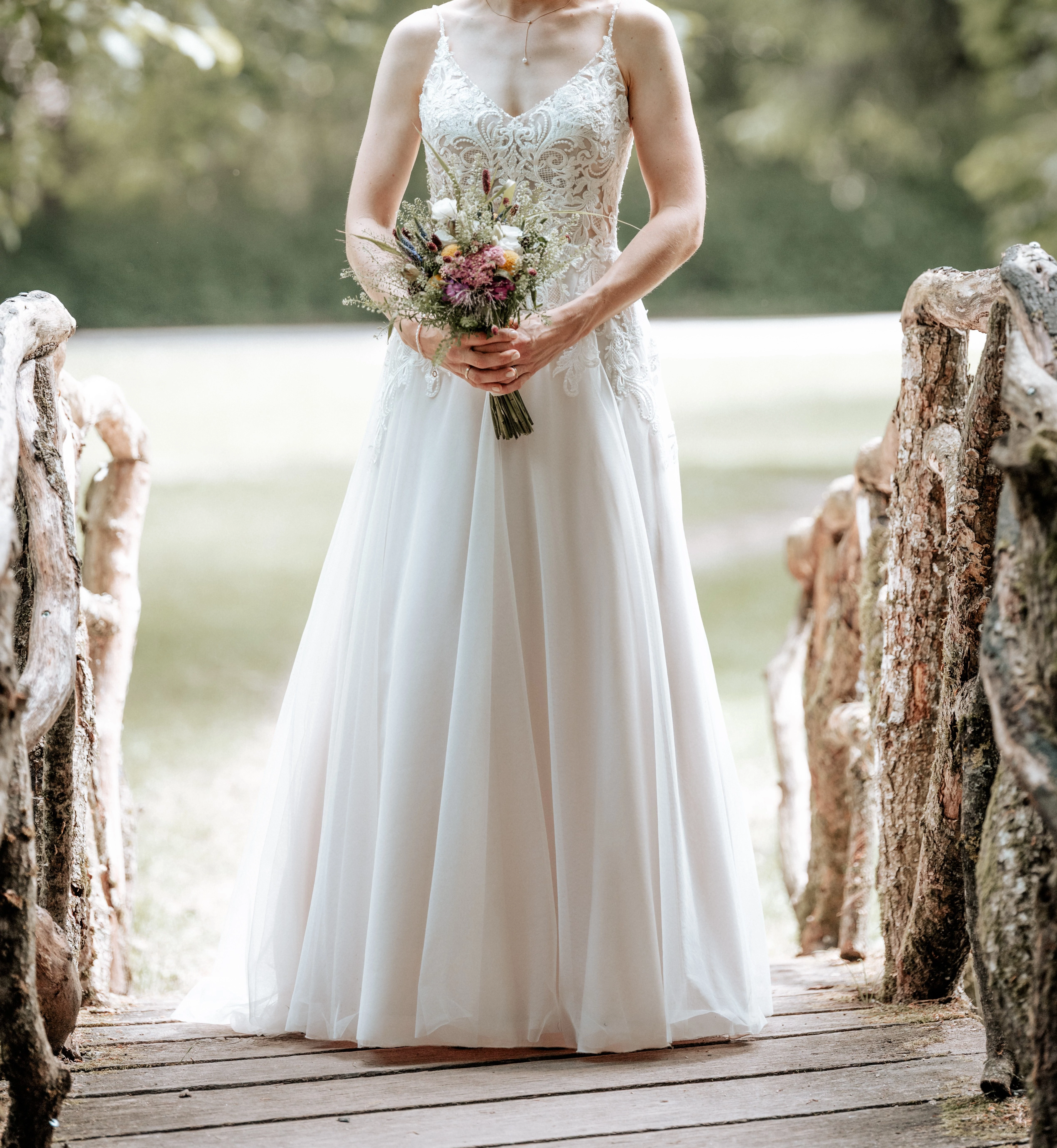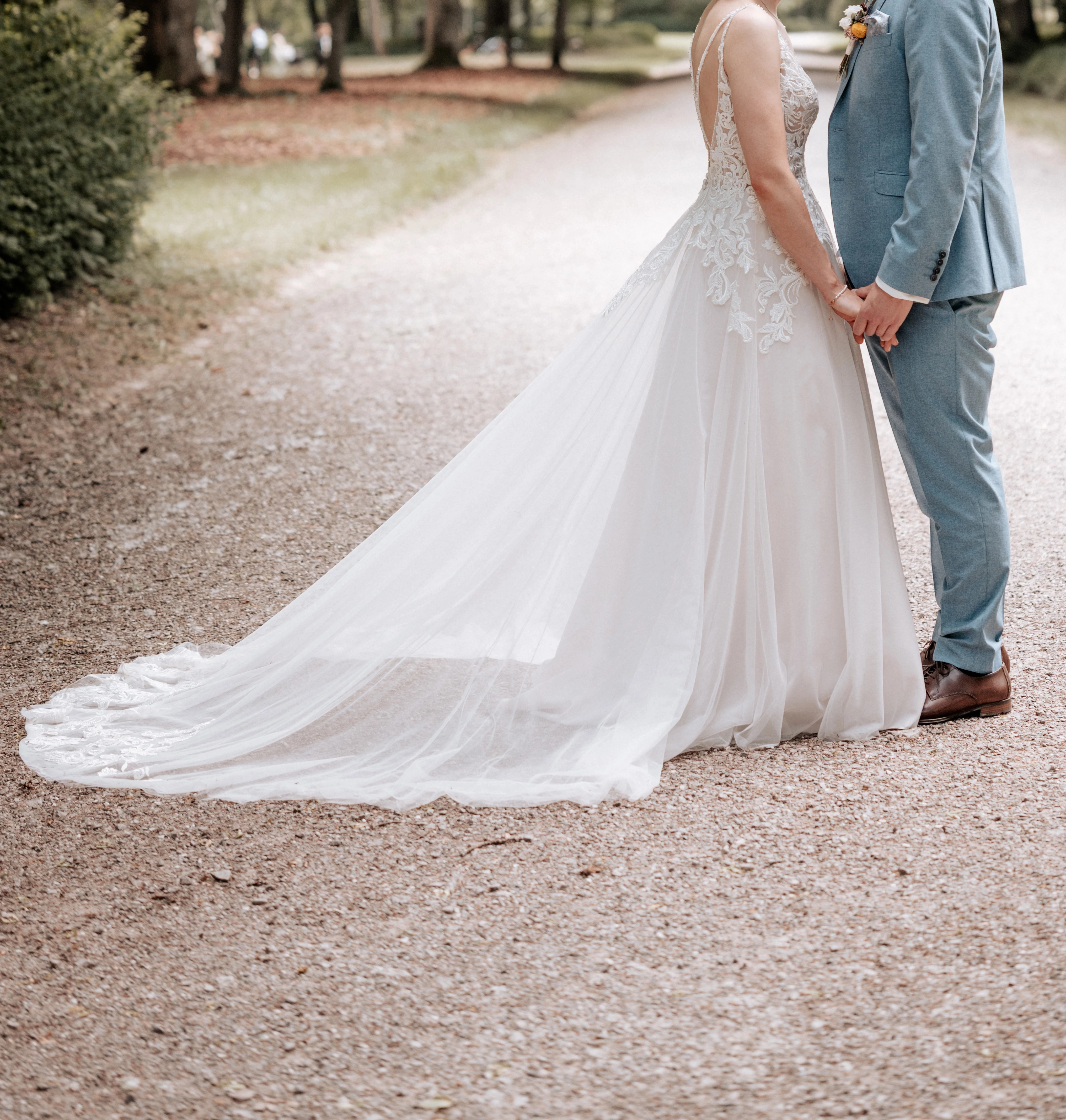 "Besonders gut hat mir an dem Kleid der offene Rücken gefallen und die lange Schleppe. Die Träger sind sehr zart und mit vielen schimmernden Perlen bestickt. Das Kleid fühlt sich gut an, es ist leicht und macht einfach Freude zu tragen. Der Ausschnitt war für mich perfekt- nicht zu tief- nicht zu bieder. Man kann zeigen was man hat, lässt aber nicht zu tief blicken. Die Schleppe kann man an einem Knopf hinten hochstecken. Ich habe zu den Kleid auch noch einen Unterrock und einen Schleier. "