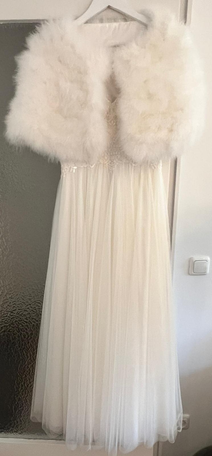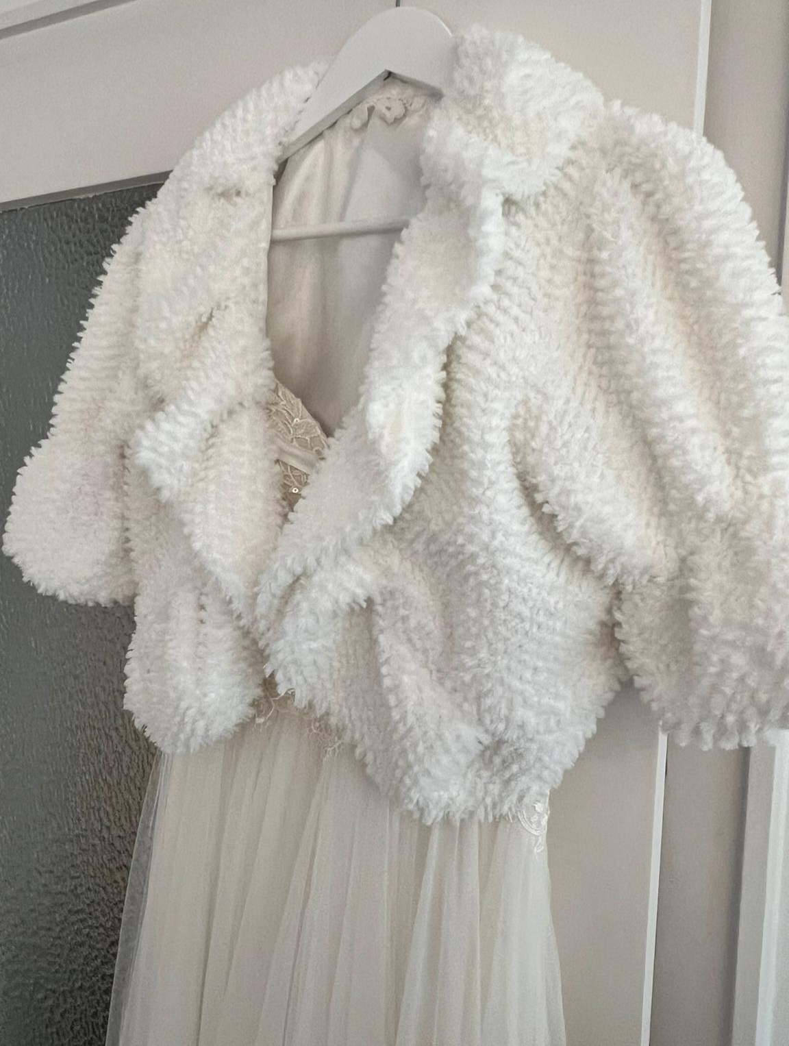 Zum Standesamt gab es ein flauschiges Jäckchen und zur freien Trauung ein Cape aus echten feinen Federn drüber (siehe Bilder).