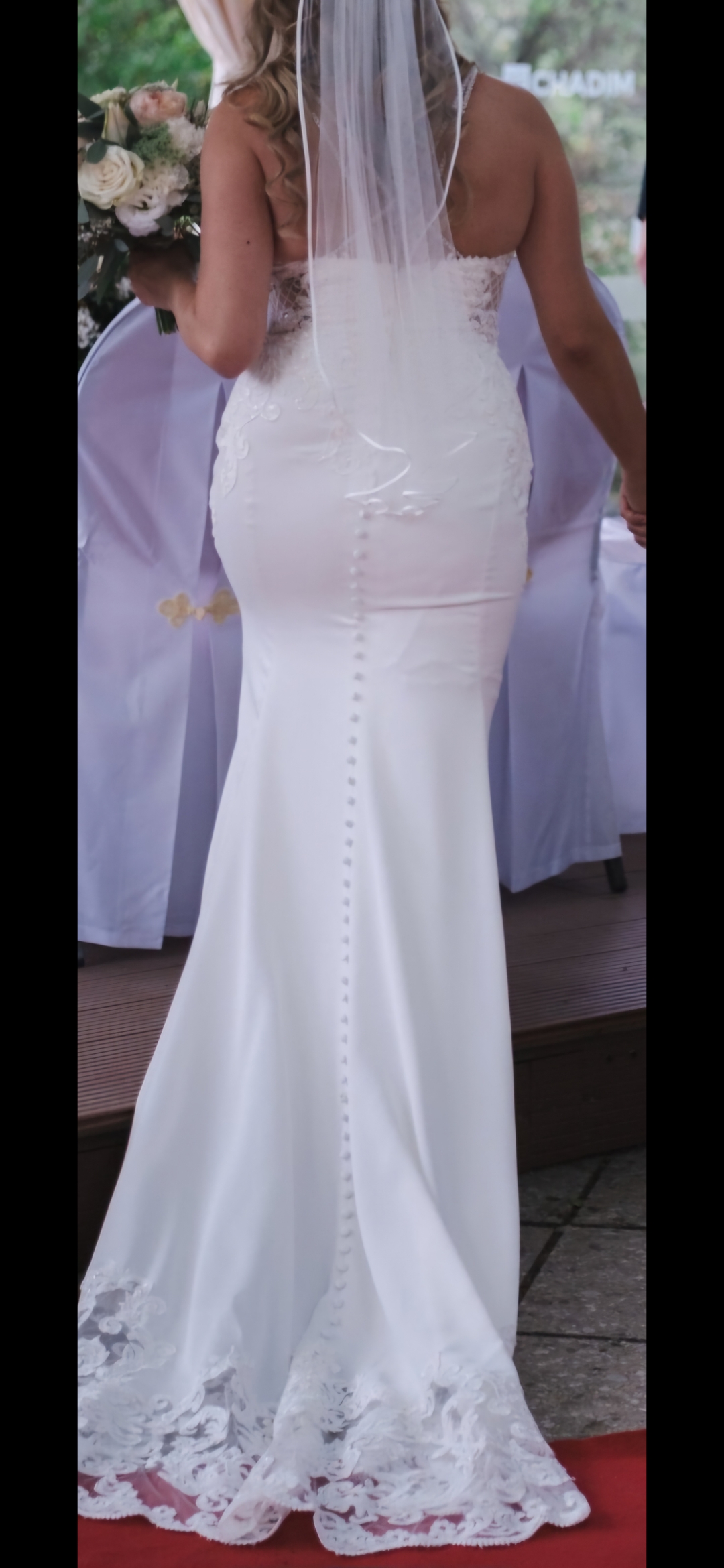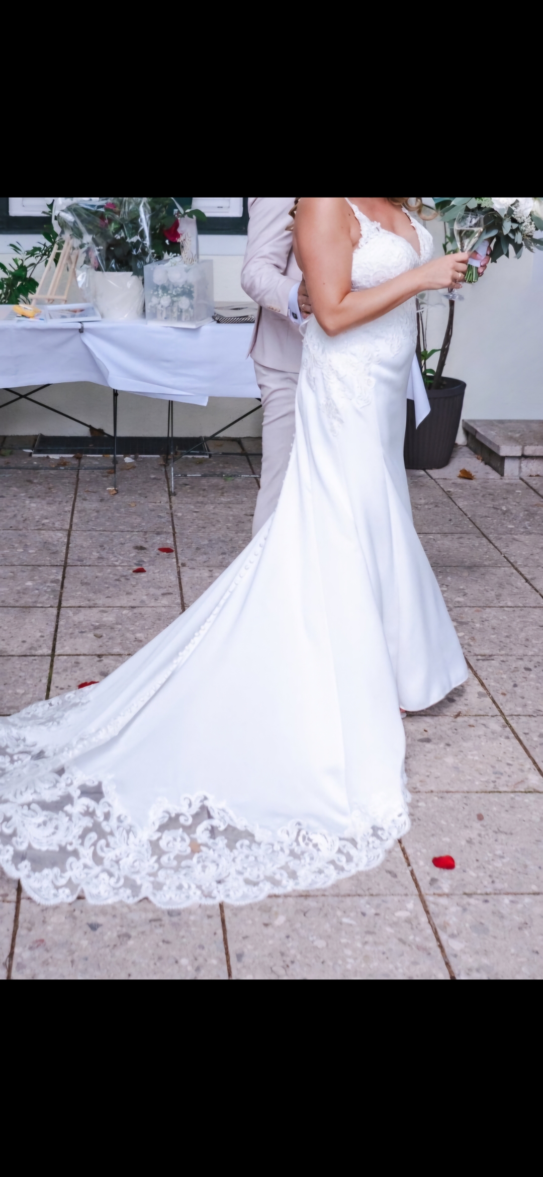 "Das Kleid ist von den Trägern bis zur Schleppe mit französischer Spitze einzigartig und sehr figurschmeichelnd."