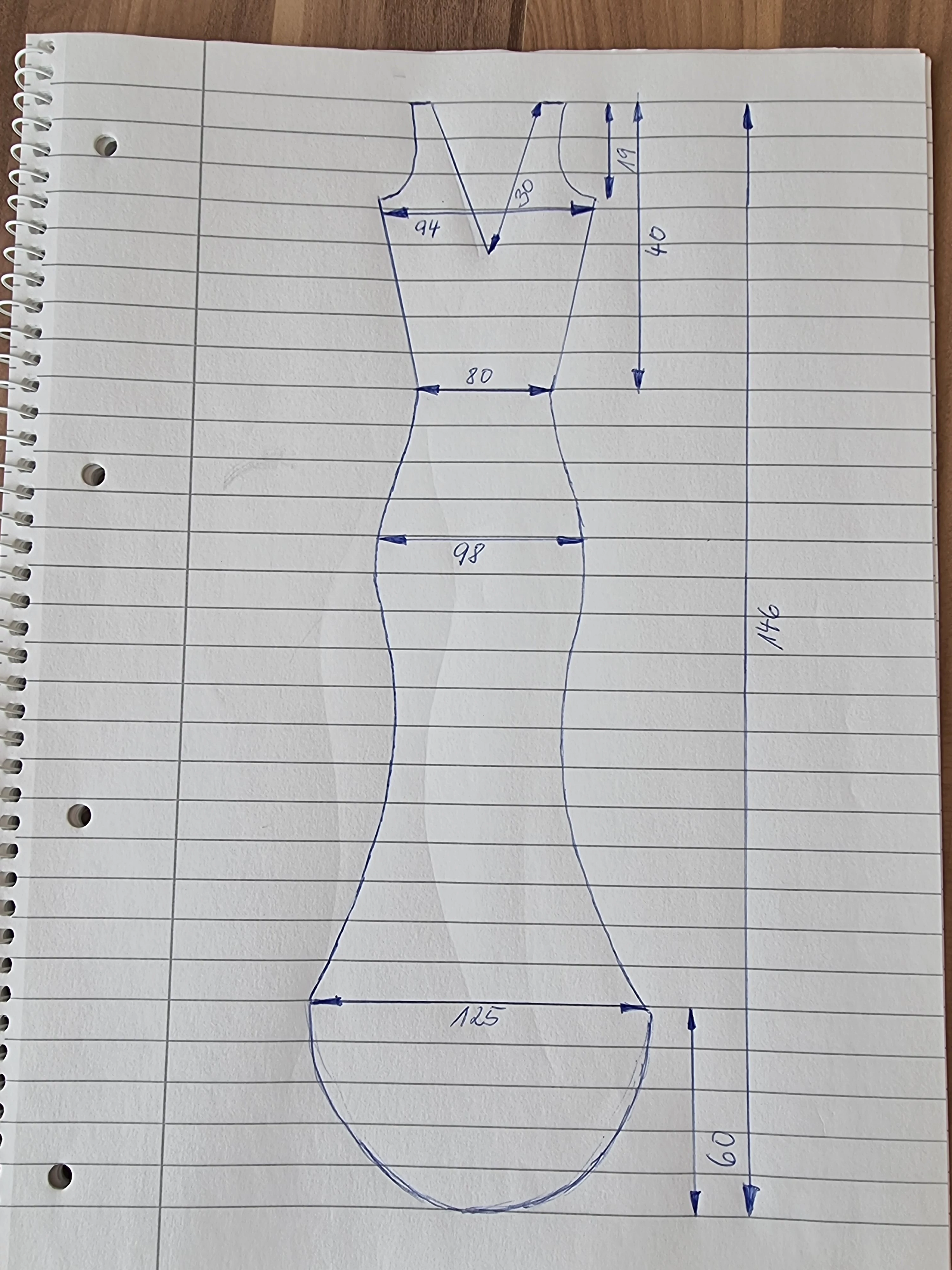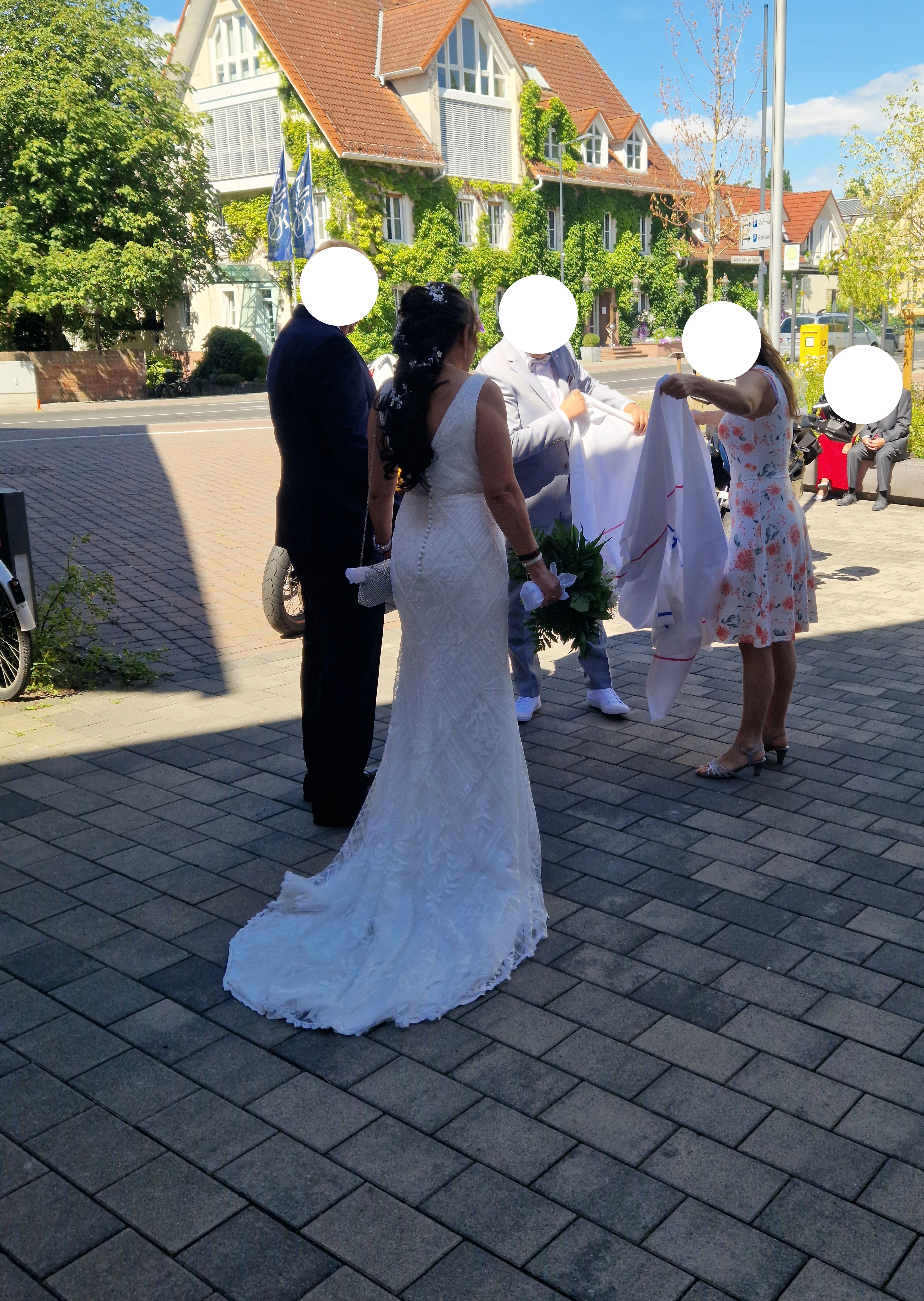 Das Brautkleid wurde meiner von einer professionellen Schneiderin angepasst, in der Länge, Träger und am Po. Eine Zeichnung mit den Maßen finden Sie bei den Bildern.