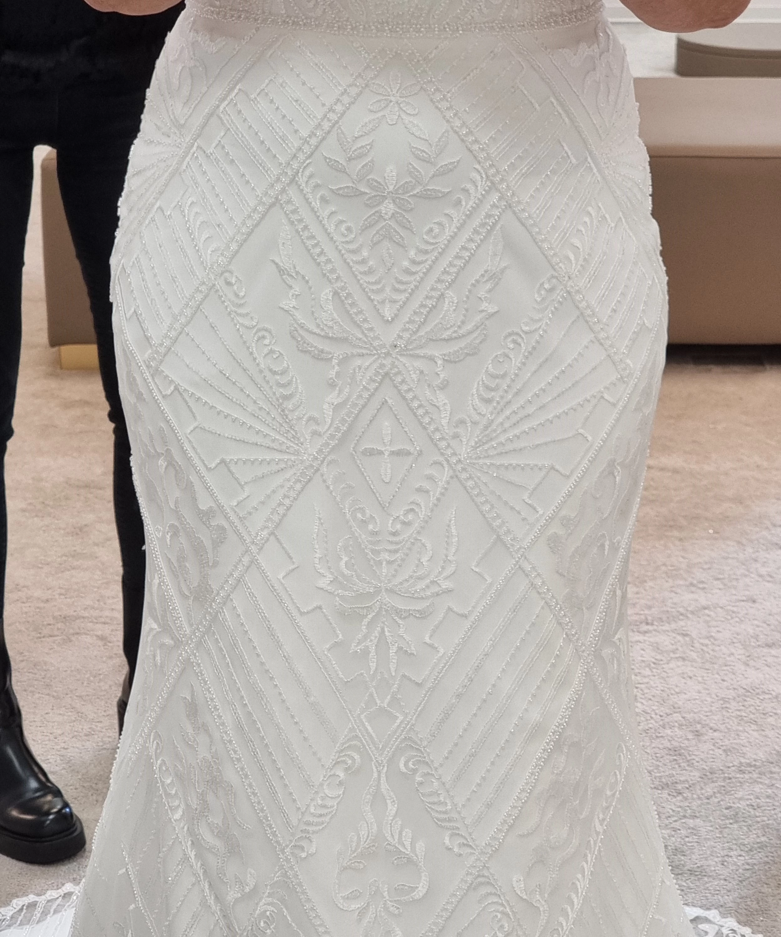 Brautkleid Dion, ein luxuriöses, perlenbesticktes Etuikleid.