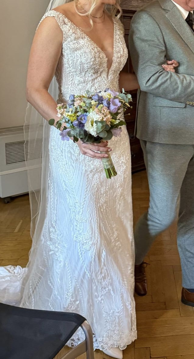 "Ich verkaufe mein traumhaft schönes Hochzeitskleid, das nur einmal getragen wurde und mir an meinem großen Tag so viel Freude bereitet hat. Ich hoffe, dass es einer neuen Braut genauso viel Glück bringt wie mir. 🤍