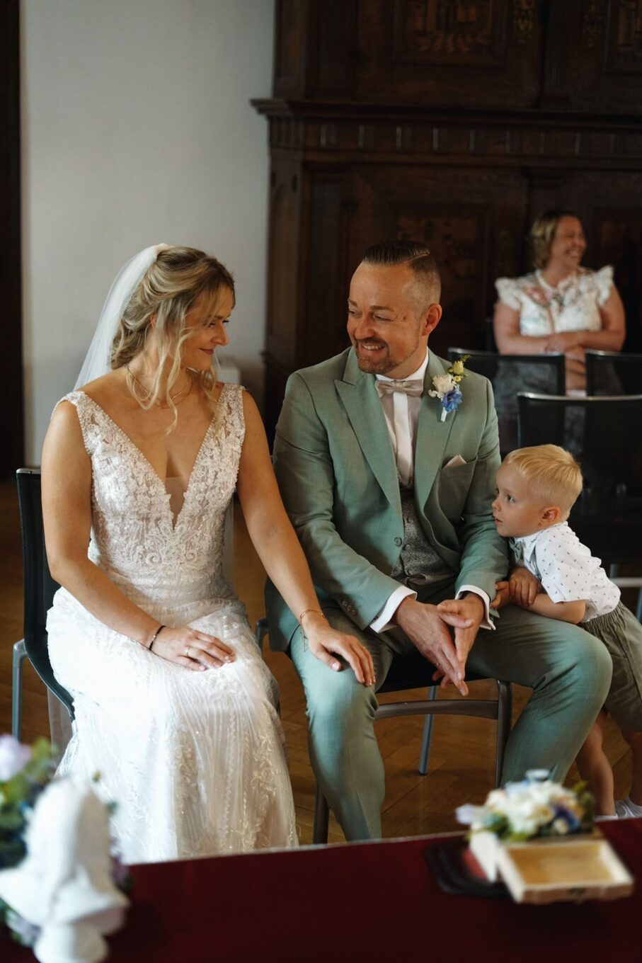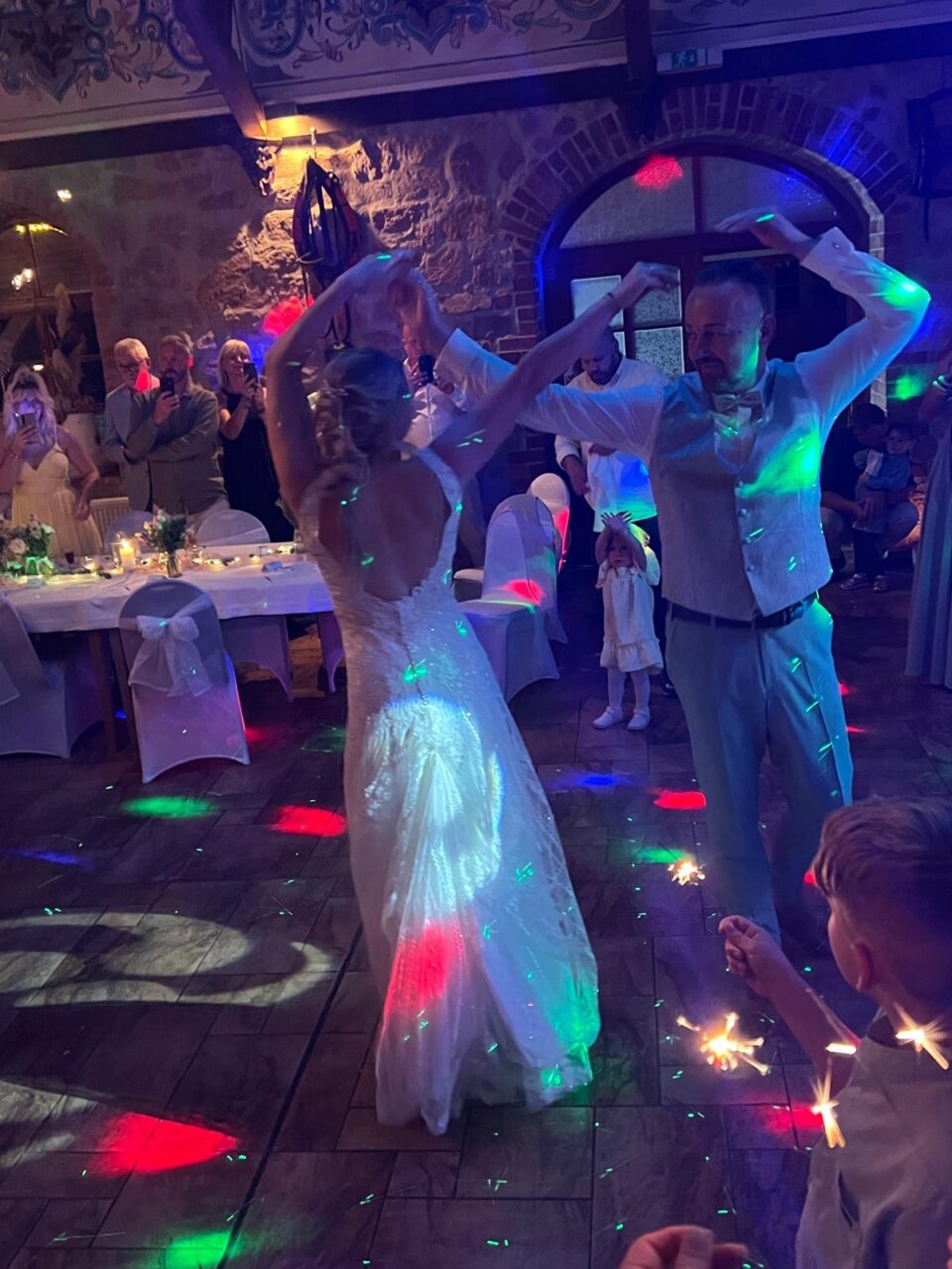 Die lange Schleppe kann mit einem kleinen Haken hochgesteckt werden – perfekt zum Tanzen!