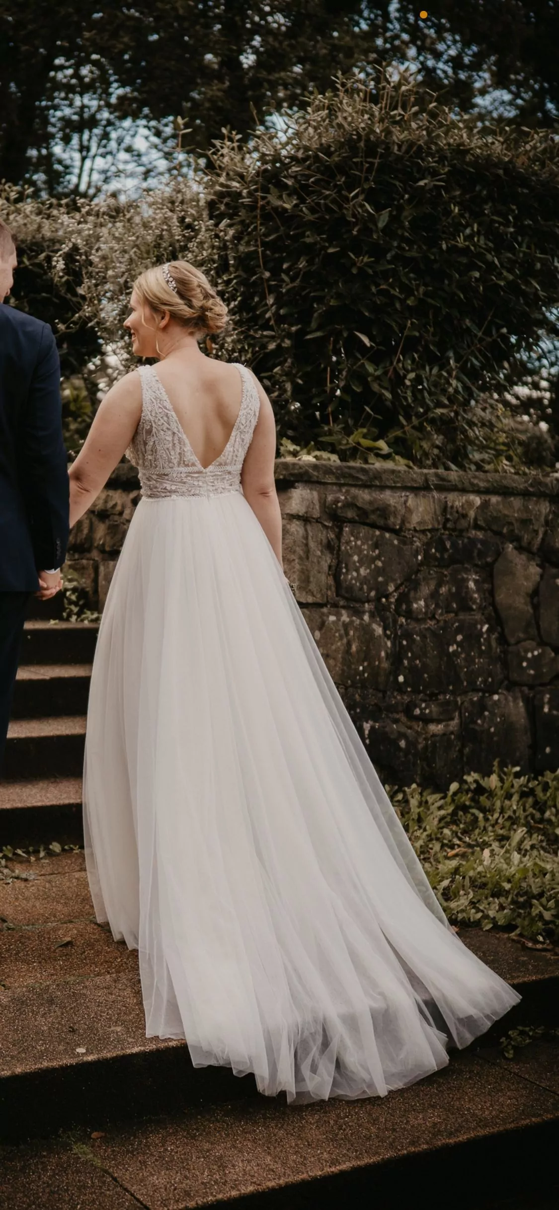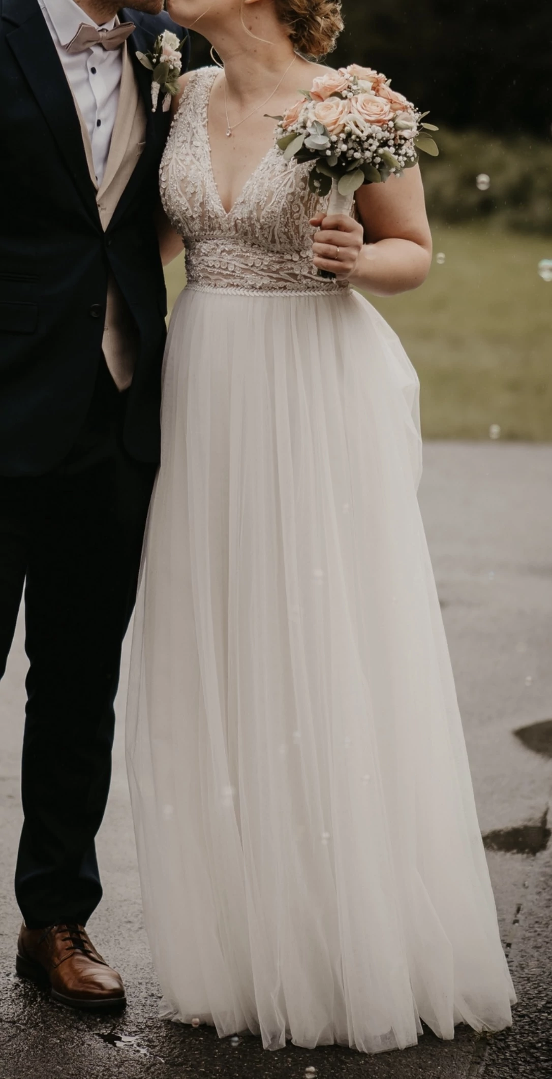 "Das Kleid verfügt über eine Schleppe, welche man zum Tanzen etc. hochstecken kann. Das Kleid ist durch den leichten Stoff super angenehm zu tragen. 🙂 "