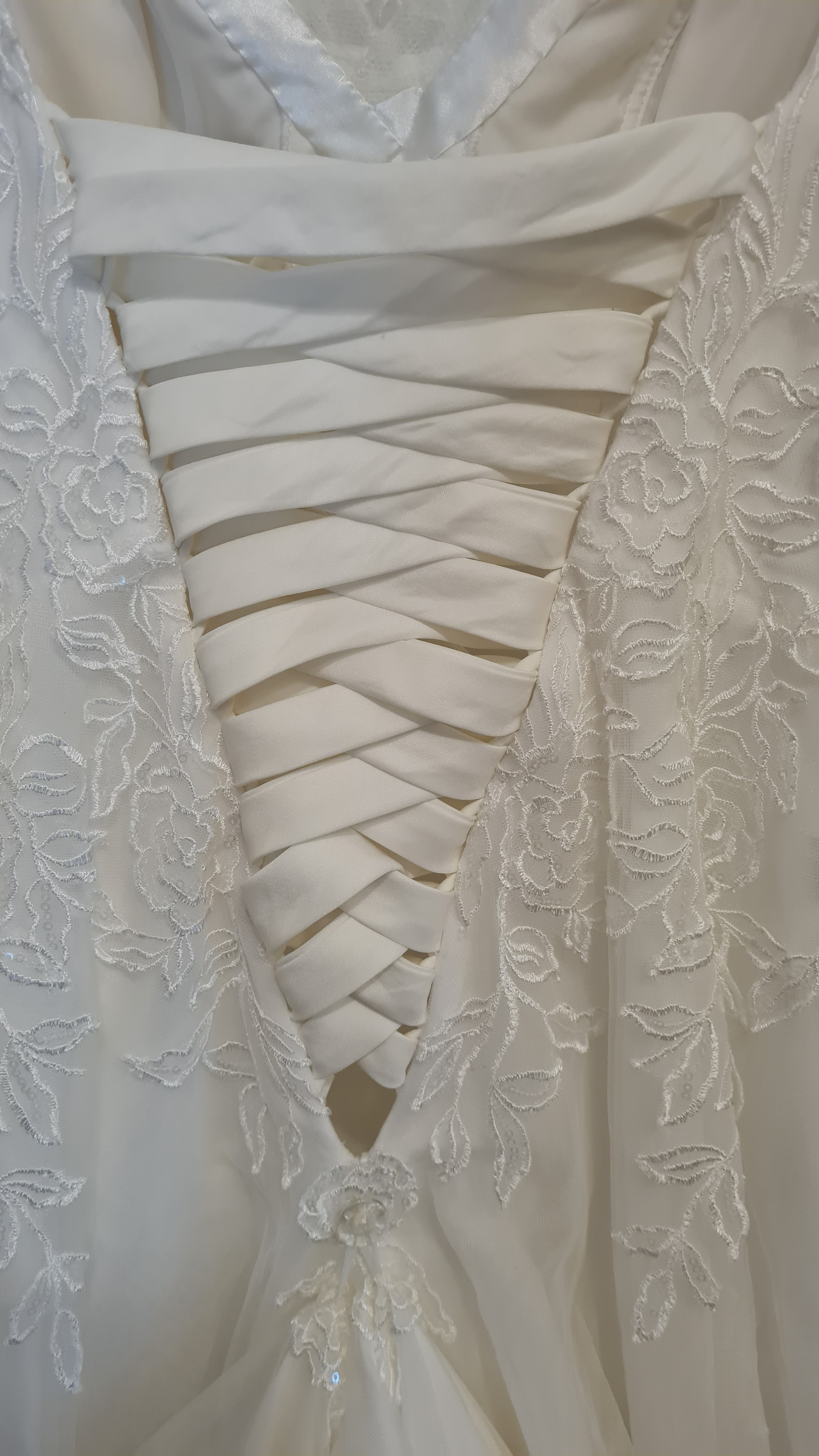 Durch die Schnürung am Rücken und die angepasste Blende kann die Größe etwas flexibler angepasst werden. Die Schleppe kann mit zwei in der Stickerei versteckten Laschen an einem Knopf direkt unter der Schnürung hochgehängt werden. Die schmalen und weichen Träger sind sehr angenehm und komfortabel.
