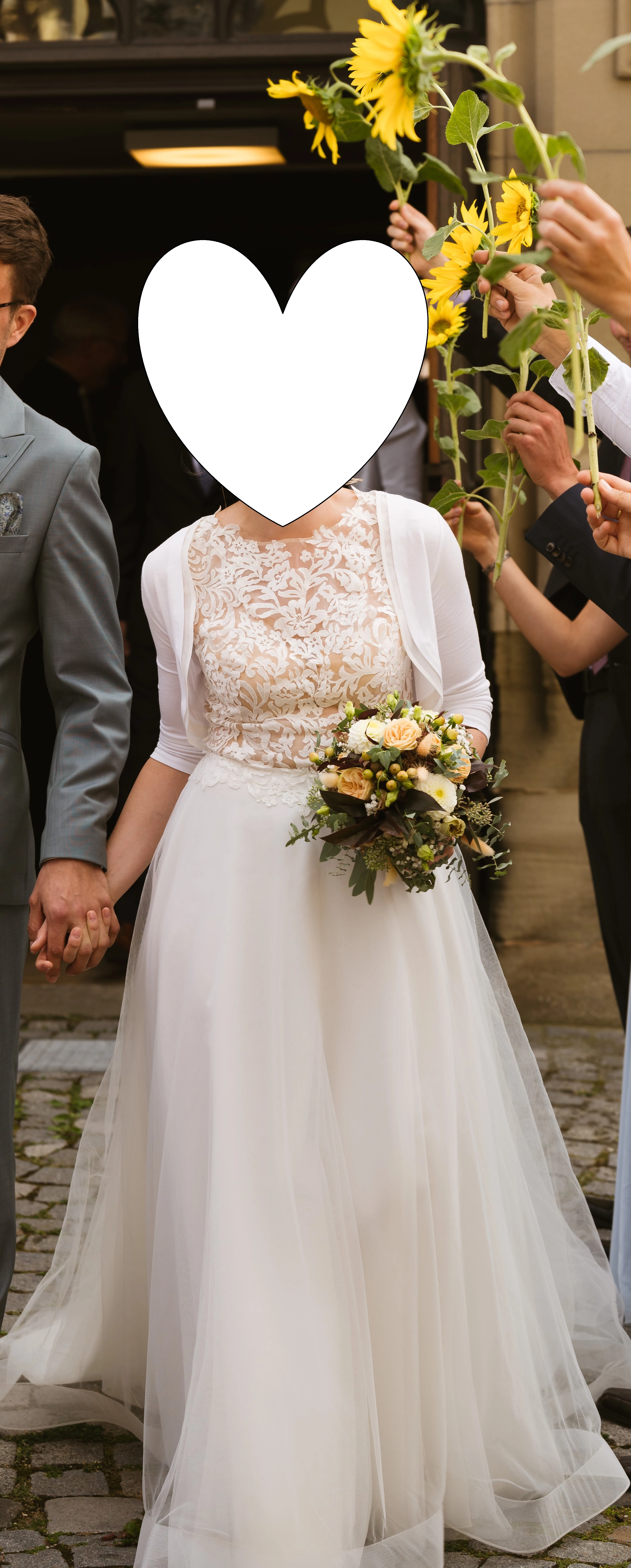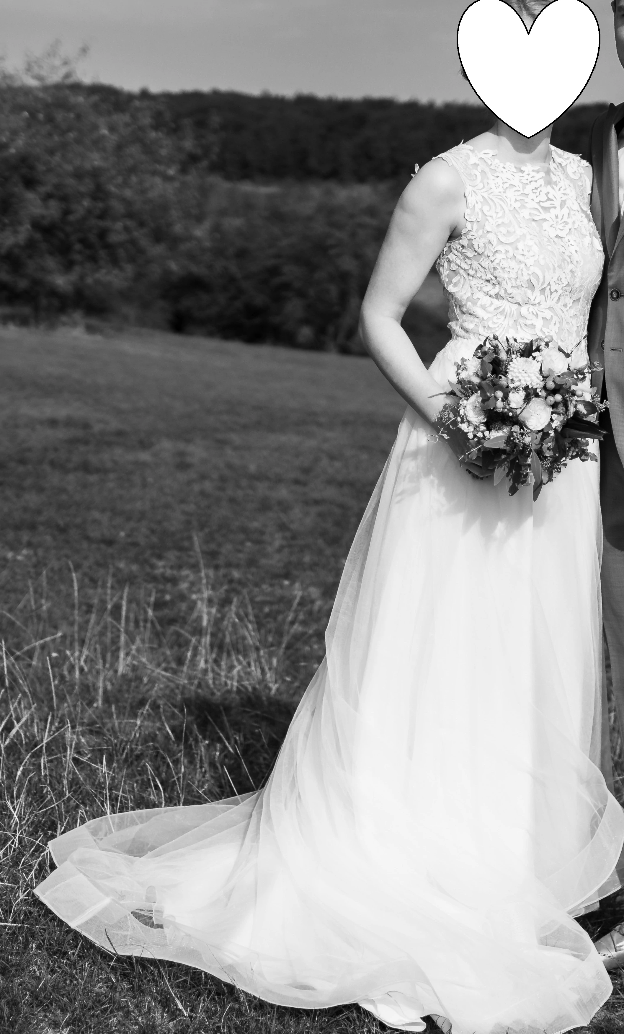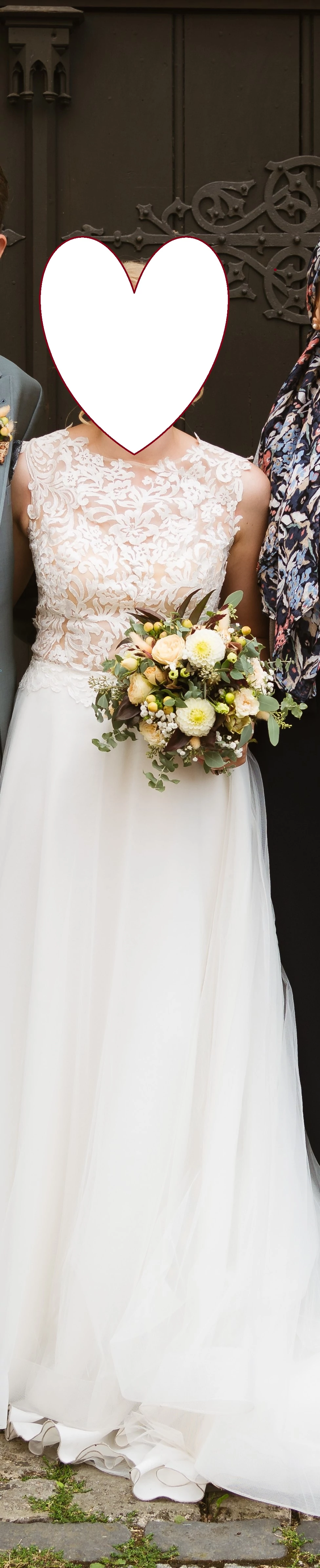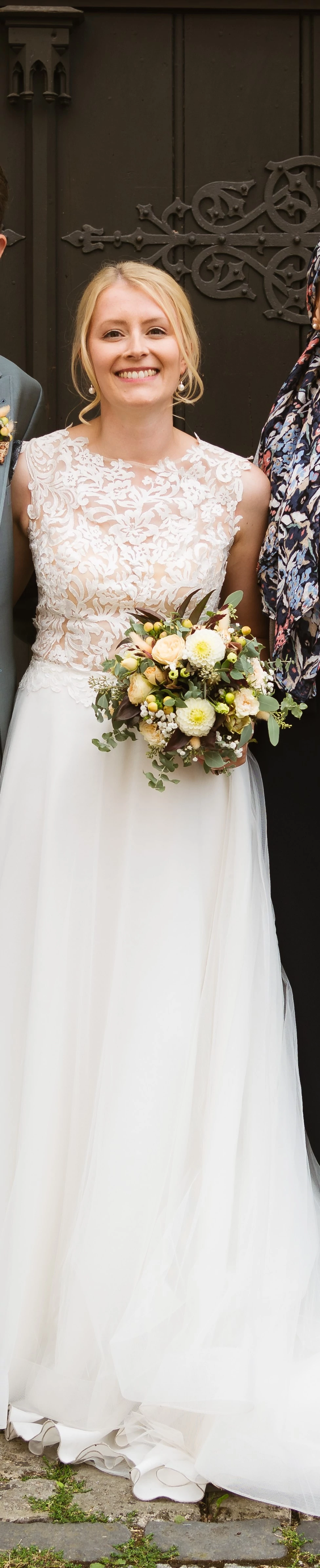 "In meinem wunderschönen Brautkleid von "White One" habe ich mich den ganzen Tag super wohl gefühlt. Die floralen Spitzen-Applikationen und der Netz-Rücken-Ausschnitt machen das Kleid zu einem echten Hingucker. Die A-Linie schmeichelt der Figur und die Soft-Tüll-Lagen fallen zauberhabt und drehen sich beim Tanzen wunderbar mit. Besonders edel wirkt auch die Knopfleiste am Rückenausschnitt. Das Kleid sitzt auch obenherum richtig gut, dennoch fühlt man sich nicht eingezwängt. Da ich einen Klebe-BH getragen habe, wurden die Cups professionell heraus getrennt, können aber jederzeit wieder eingenäht werden - sie sind komplett ungenutzt. Ich würde mich freuen, eine zweite Braut mit dem Kleid glücklich zu machen 🙂 Es ist professionell chemisch gereinigt und bereit für seinen nächsten Auftritt! "