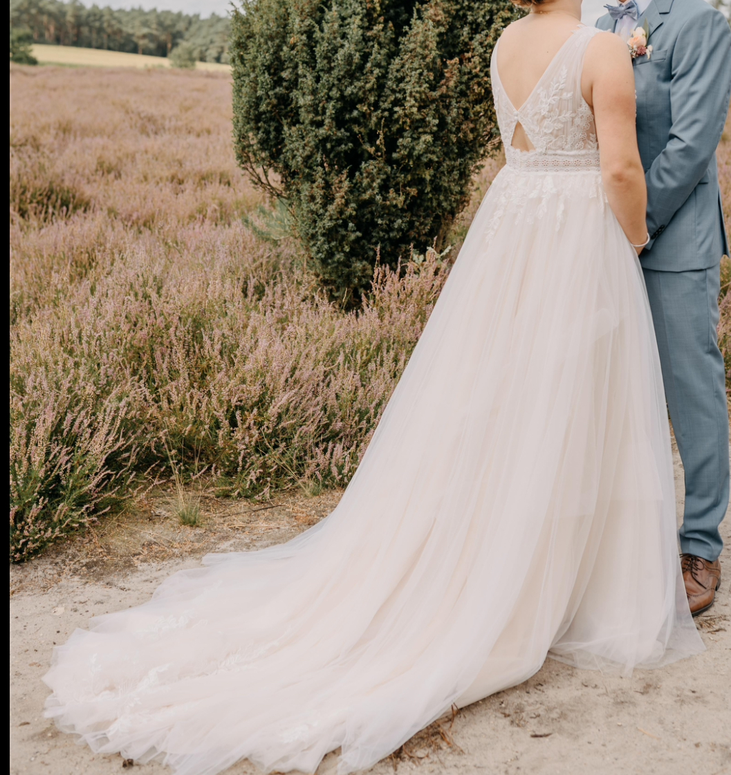 "Die Spitze, der Tüll, den Strickmuster, der Rücken und die Farbe (Light Peach). Es ist so ein Traumkleid! Am liebsten möchte man es nicht ausziehen! Ich möchte dass es eine weitere Braut glücklich macht. Es ist vieles änderbar da ich kaum Änderungen hatte. Die Cups sind nur mit 2 Nähten fest und somit problemlos austauschbar. "
