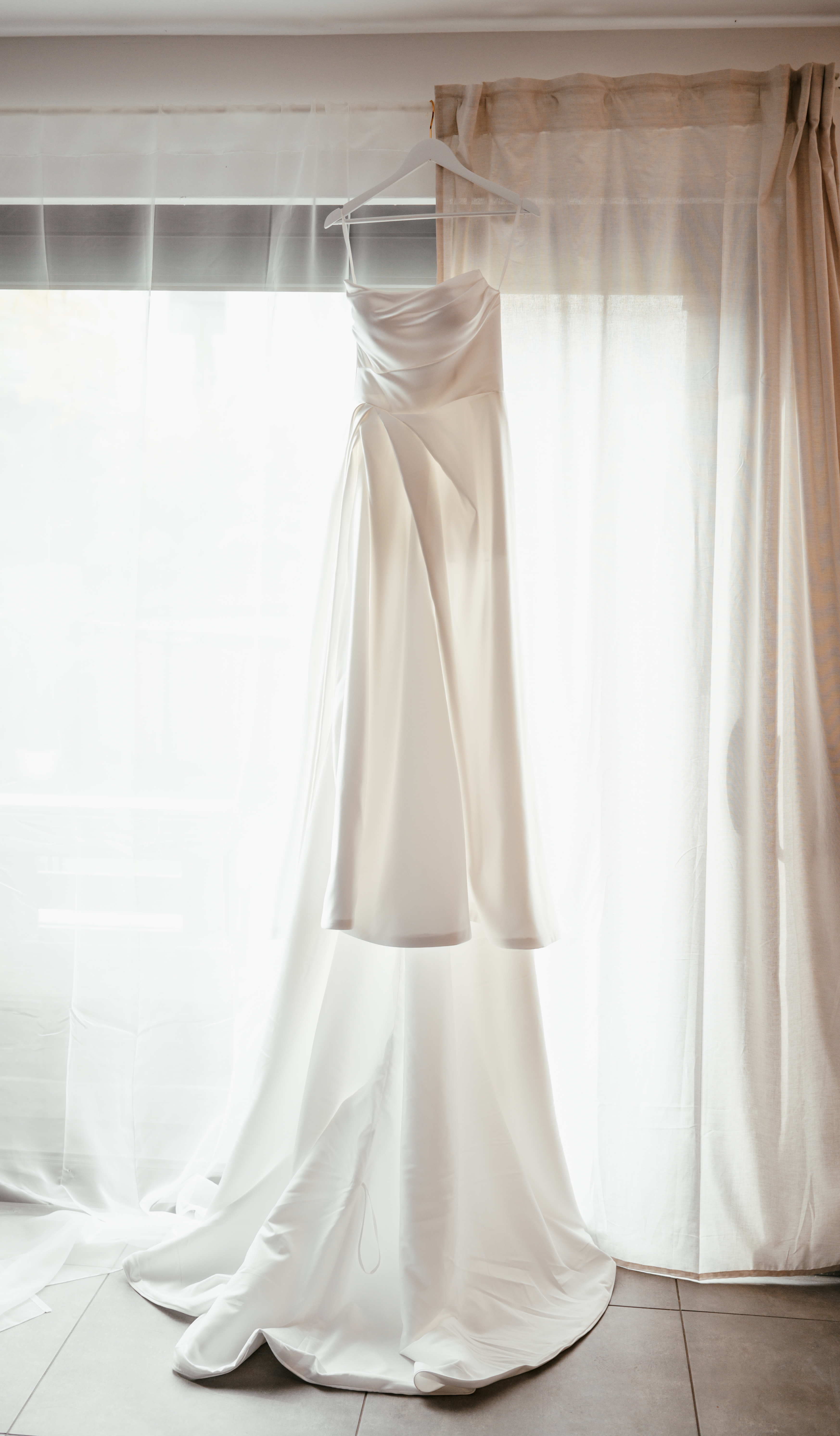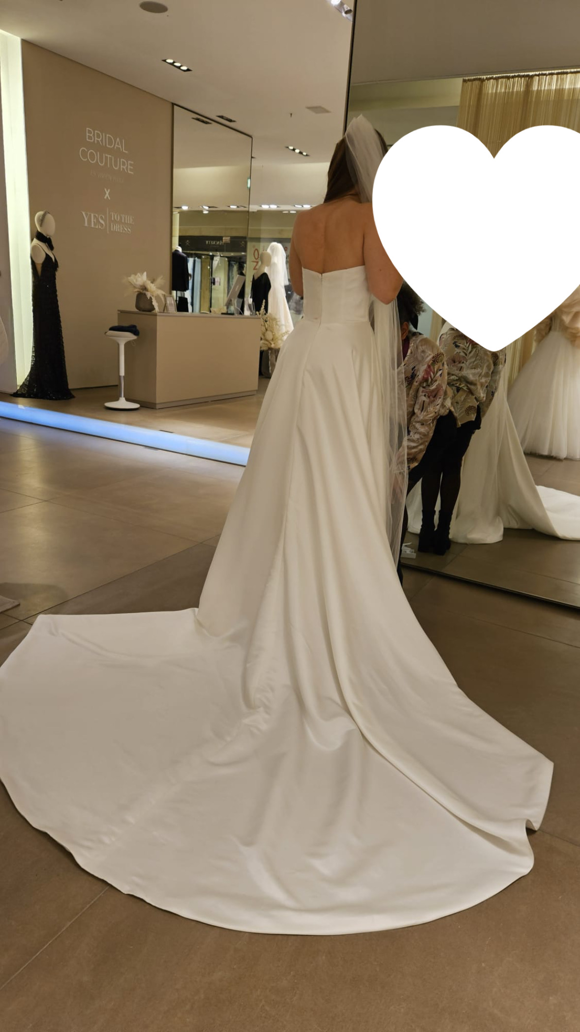 "Bei dem Kleid handelt es sich um ein trägerloses Couture Kleid aus Seide. Es hat einen Beinschlitz (mit kurzem Unterrock) und eine lange Schleppe. Es hat zusätzlich herausnehmbare Cups. Das Kleid ist wie neu, da es nur einige Stunden getragen wurde und anschließend in der Reinigung war.